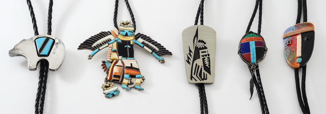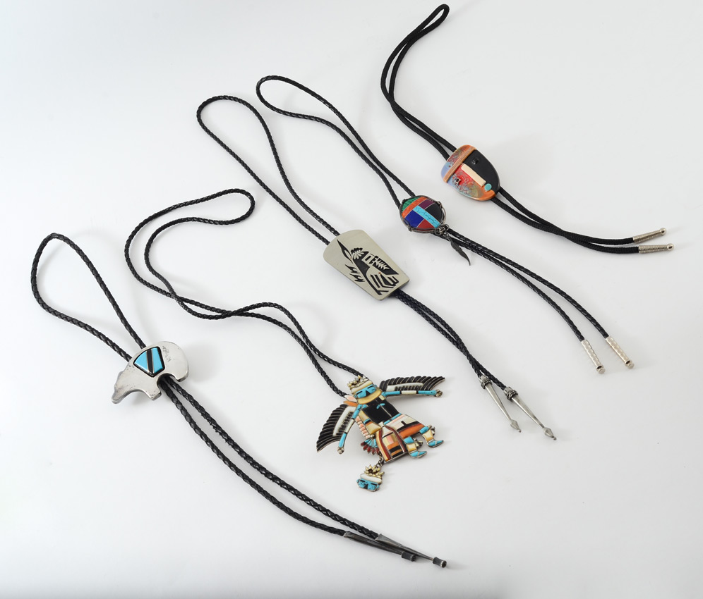 5 SOUTHWEST BOLO TIES: 5 total to include 1) Multi stone eagle dancer, signed RW, 3 1/2''. 2) Bear fetish with stone cabochon, unsigned, 1 3/4''. 3) Oval multi stone inlay with feather drop, unsigned, 1 3/4''. 4) Stainless steel with engraved design, unsigned, 3'' h. 5) Porcelain face, unsigned, 2 3/8''.