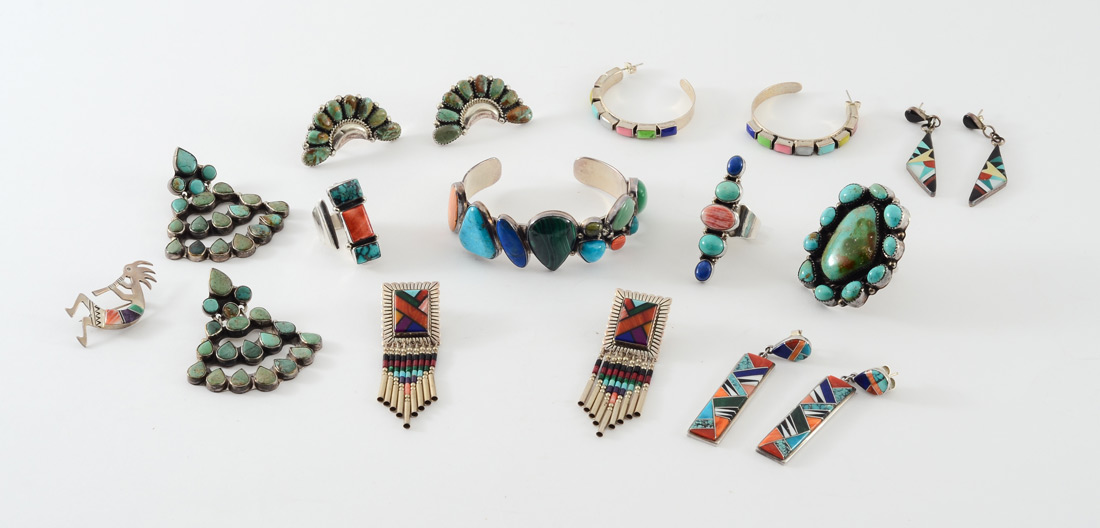 AN ASSORTMENT OF ZUNI STERLING JEWELRY: Southwest Indian, mostly Zuni & Navajo, 17 pieces total, marked highlights to include 1) L. Bennett multi stone bracelet, 2 1/2'' dia. 2) Herbert Harvey turquoise ring, size 10. 3) Quoc Turquoise Inc., inlaid multi stone earrings. 4) Oscar Betz turquoise earrings, 2 3/8''. 5) Nakai multi stone ring, size 6 1/4''. The balance of multi stone and turquoise items unsigned.