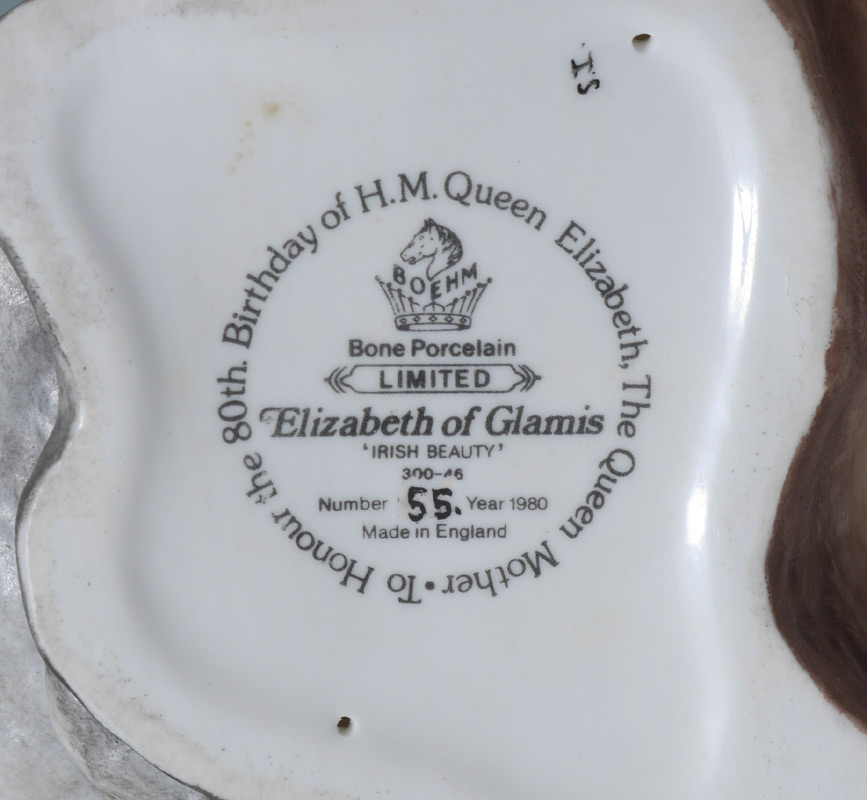 BOEHM PORCELAIN IRISH BEAUTY ELIZABETH OF GLAMIS ROSE 300-46: Figural Group To Honor the 80th Birthday of Queen Elizabeth. #55 in a limited edition, 1980. Measures approx. 8'' x 8'' x 6''.