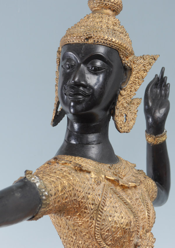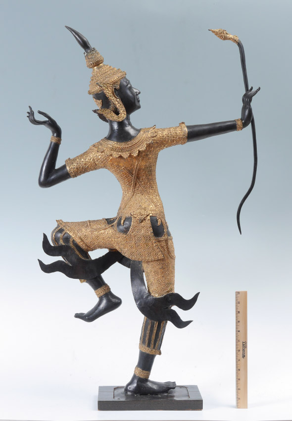 LARGE THAI GILT BRONZE ARCHER: Figure of a Thai or Balinese archer with gilt accents to clothing and tip of bow. Affixed to wood base, overall measures 39 1/2'' h. x 24 1/2'' x 6''.