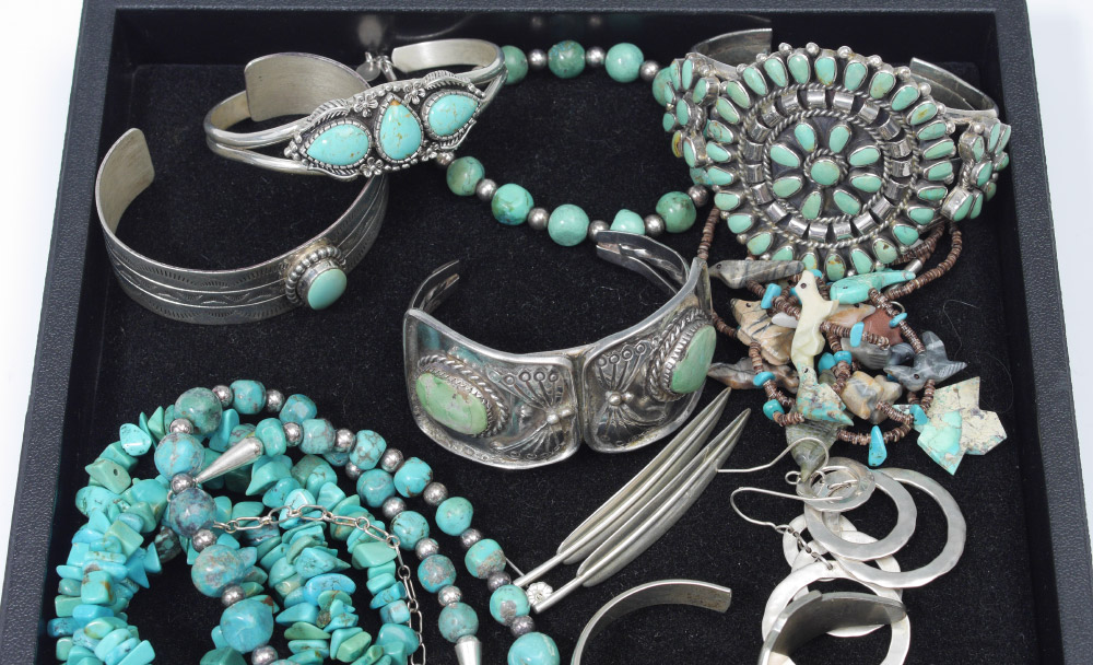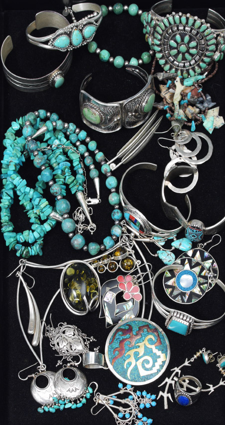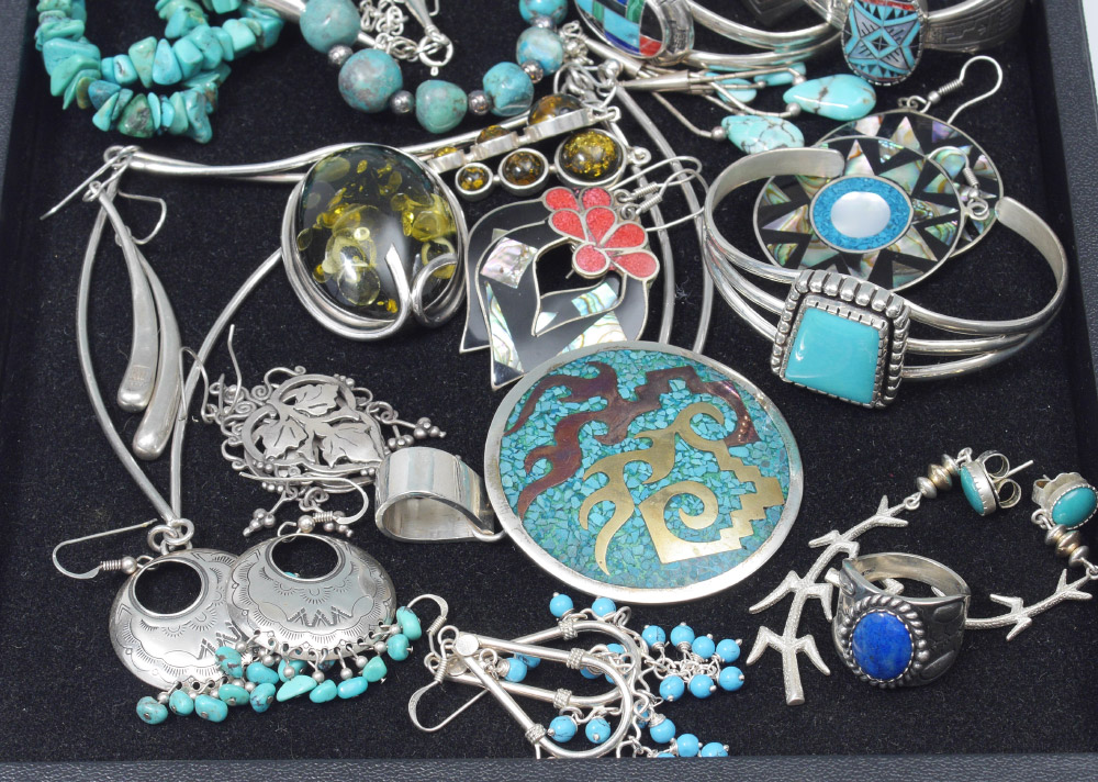ESTATE LOT OF STERLING JEWELRY: Mostly a mixture of Mexican and Native American makers. Featuring Roderick & Marilyn Tenorio Morning Star inlay bracelet. Several pieces with the Relios Jewelry shop mark - turquoise necklaces, bracelet and earrings. Robert Lee Morris RLM Studio is also a frequent mark. Sold as a lot.