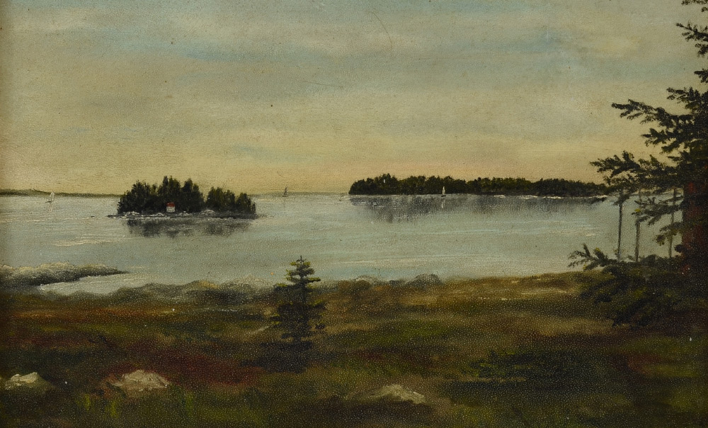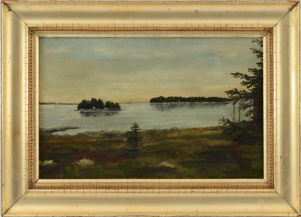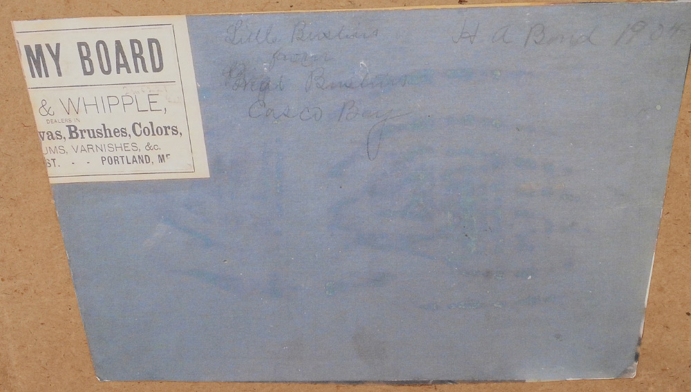 CASCO BAY PAINTING BY H.A. BOND? 1904: Oil/Board, sight size 8'' x 12 1/2'', titled, signed, and dated verso, period gilded frame, 11 1/4'' x 15 3/4''.