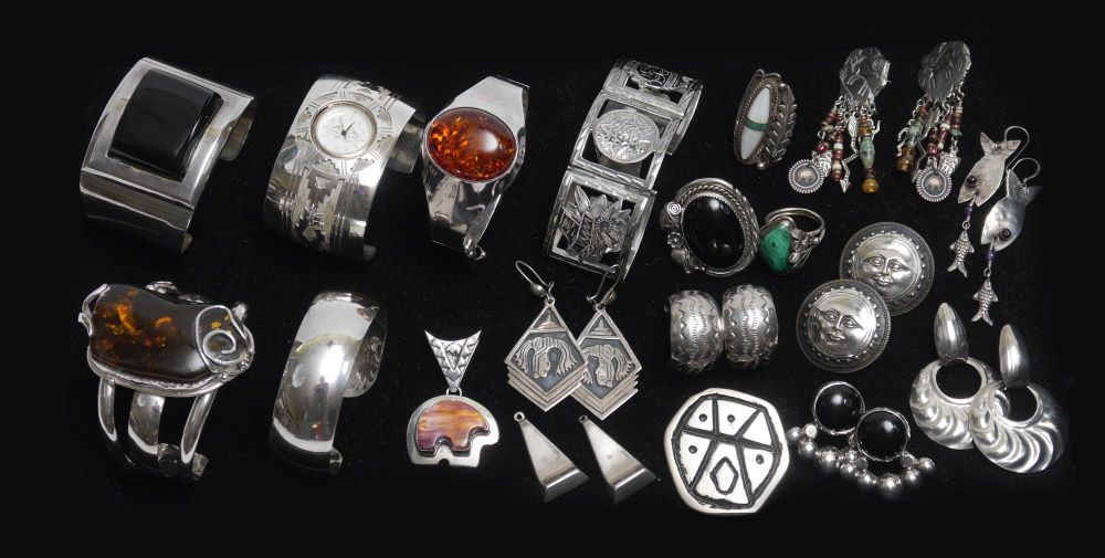 COLLECTION OF MEXICAN AND SOUTHWEST STERLING SILVER JEWELRY: An assembled collection to include 5 bracelets, two with large amber cabochons, one Kirk & Sons with inscription ''1975 Tampa Woman of Achievement'', one with large obsidian, one pierced. 1 silver cuff watch. 2 pendants, one bear fetish with stone. 8 pairs of earrings, assorted styles. 3 assorted stone inset rings.