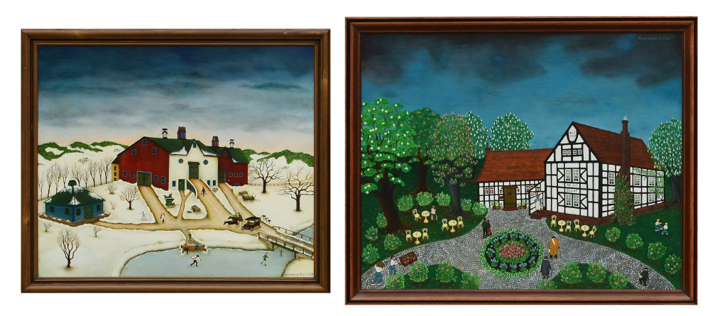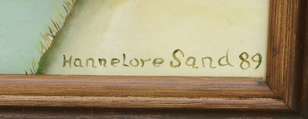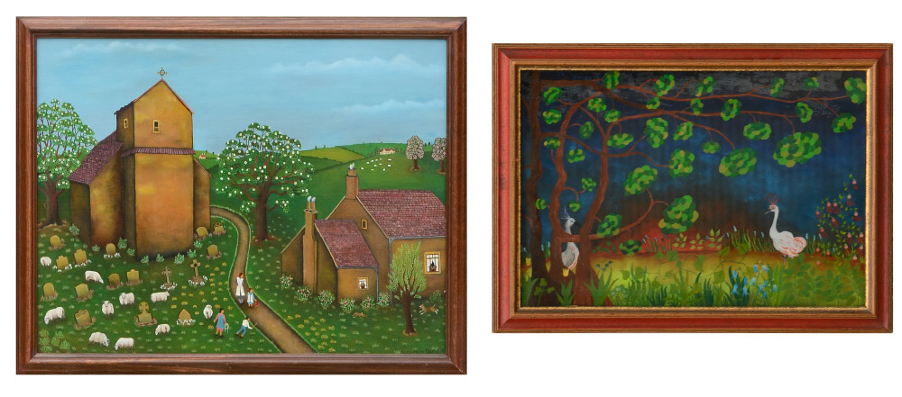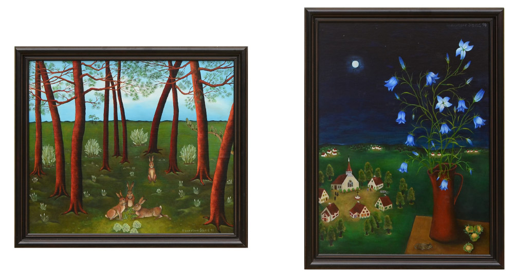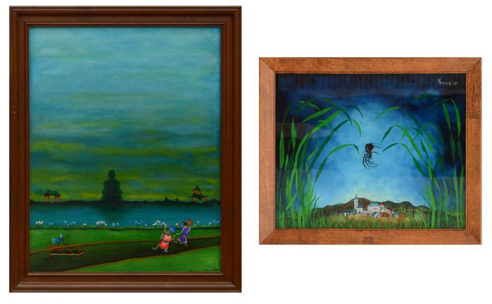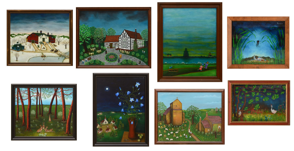 SAND, Hannelor, (American, 20th Century): 8 Surreal Primitive Folk Style Paintings to include 1) Nocturnal Scene with Flower Vase and Village View, Oil/Linen, sight size 24'' x 18'', signed upper right, dated '95-'96 and titled ''Bellflowers Background'' verso, framed, 27'' x 20 3/4''; 2) ''In the Cotswolds'', Oil/Linen, sight size 18'' x 24'', signed lower right and dated '96, signed, titled, and dated verso, framed, 20 1/4'' x 26 1/2''; 3) ''It Could Be Worse'', Oil/Linen Mounted on Cardboard, sight size 20'' x 24'', signed lower right and dated '89, signed, titled, and dated verso, framed, 22 1/2'' x 26 1/2''; 4) ''Bangkok, the Emerald Buddha'', Oil/Canvas, sight size 22'' x 28'', signed lower right and dated '88, signed, titled, and dated verso, framed, 32'' x 26''; 5) ''In the Heart of England'', also known as ''A Well-Known Restaurant in the Heart of England'', Oil/Canvas, sight size 22'' x 28'', signed upper right and dated '95, signed, titled, and dated verso, framed, 24 1/2'' x 30 1/2''; 6) Black Widow Spider with Village in the Distance, Reverse Painting on Glass, sight size 14 1/2'' x 17 3/4'', signed upper right and dated '77, oak frame, 17 1/2'' x 20 3/4''; 7) Rabbits in Forest, Oil/Linen, sight size 18'' x 22'', signed lower right and dated' 90, framed, 20 1/2'' x 24 1/2''; 8) Two Peacocks Meeting in Forest, Reverse Painting on Glass, sight size 12'' x 17 1/2'', signed upper left, framed, 15'' x 20 1/2''.