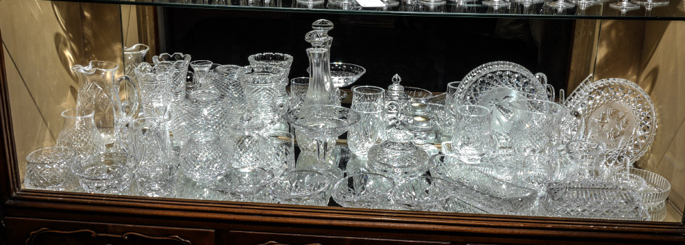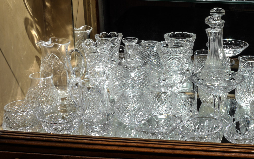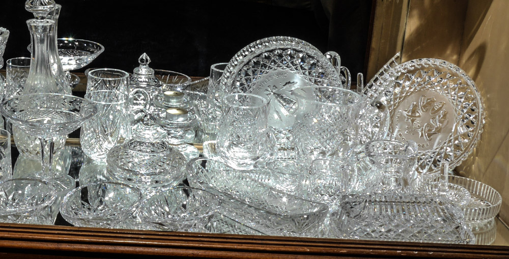 35 ASSORTED PIECES OF WATERFORD CRYSTAL: An assembled collection in a wide variety of patterns, to include 1984 & 1988 Christmas plates 8'', decanter 11'' including stopper, pitchers, butter, vases, bowls and more.