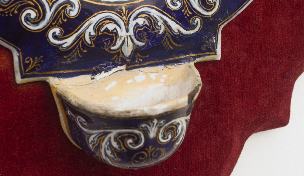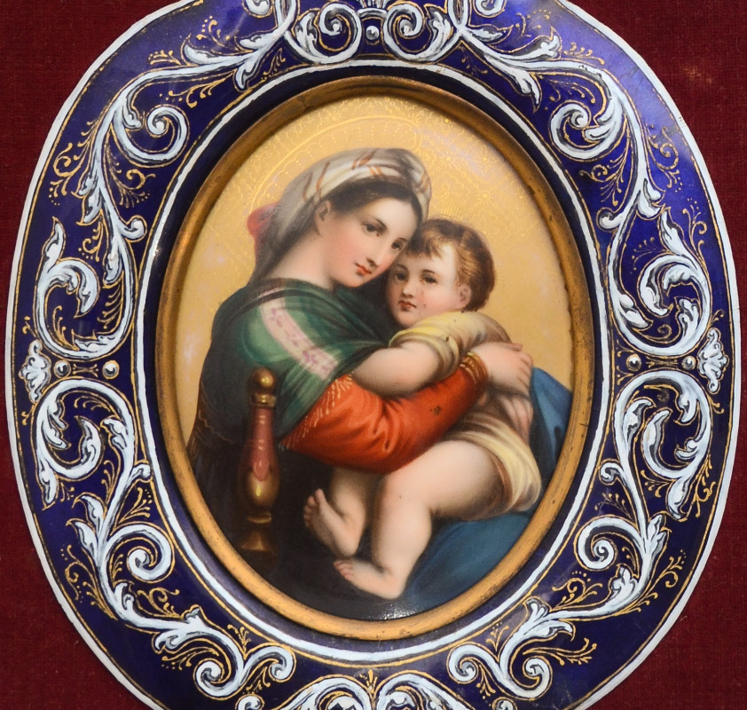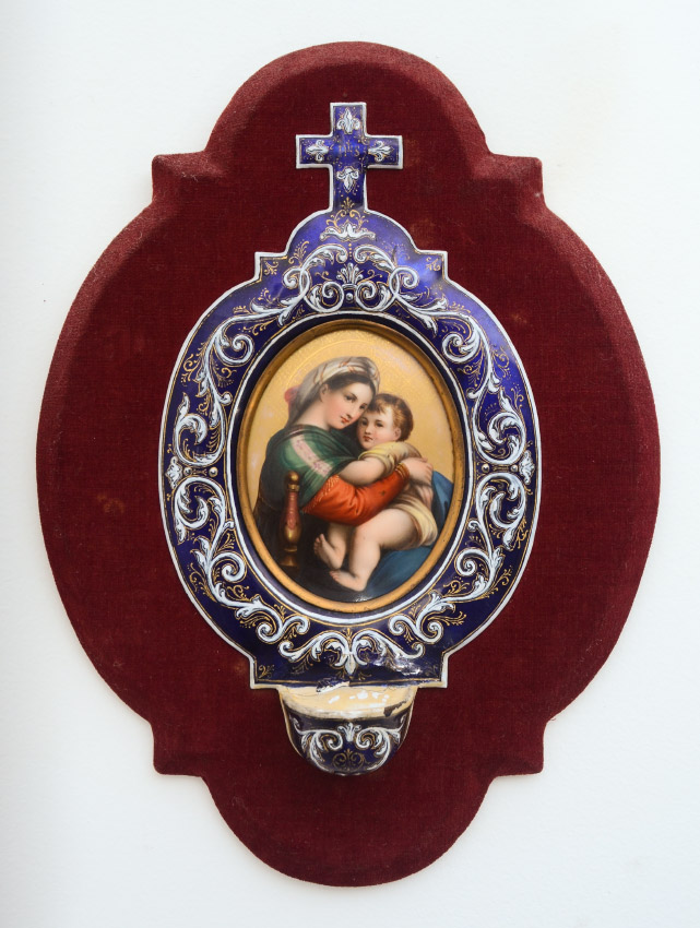 FRENCH ENAMEL & PORCELAIN HOLY WATER FONT: Hand painted porcelain center medallion featuring Madonna & Child, cobalt blue enameled frame with foliated scroll decoration, mounted on felt lined back board. Illegible French dealers label verso. 13 1/2'' h. x 10'' x 1 3/4''.