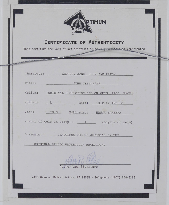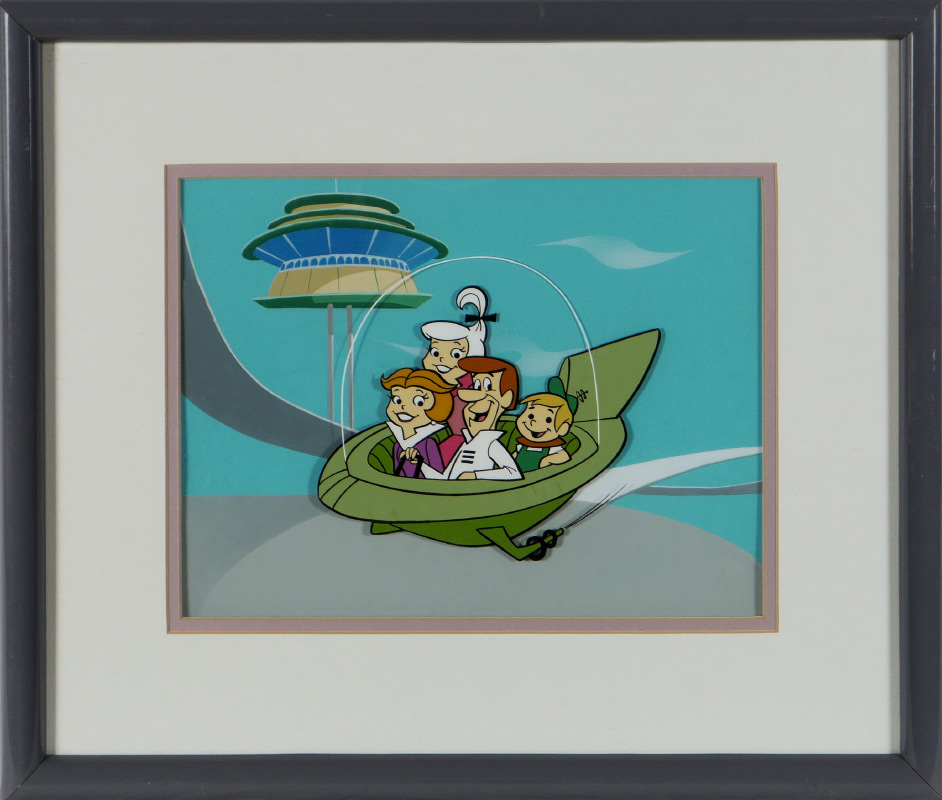 JETSON'S ORIGINAL CARTOON CEL & BACKGROUND: Cel featuring all 4 Jetson's in their aerocar, over hand painted watercolor background. Overall image sight size 8'' x 11'', framed and matted 16 1/4'' x 19 1/2''. Optimum Art COA affixed verso dating the cel to the 1970's.