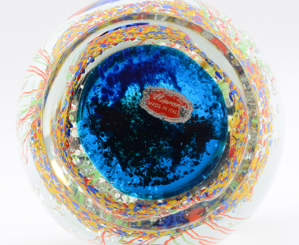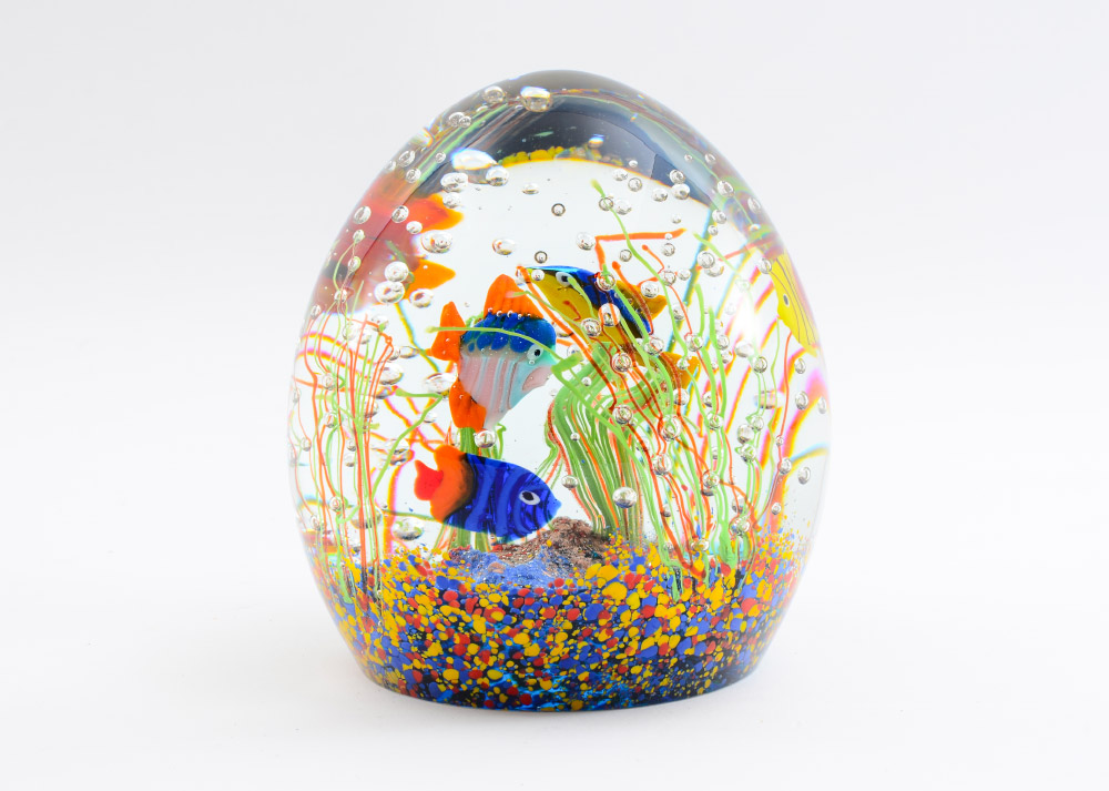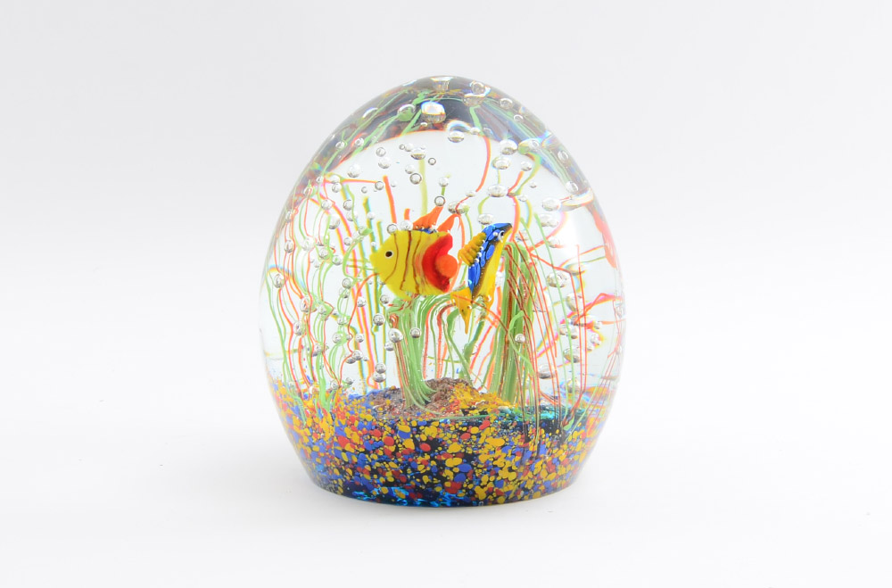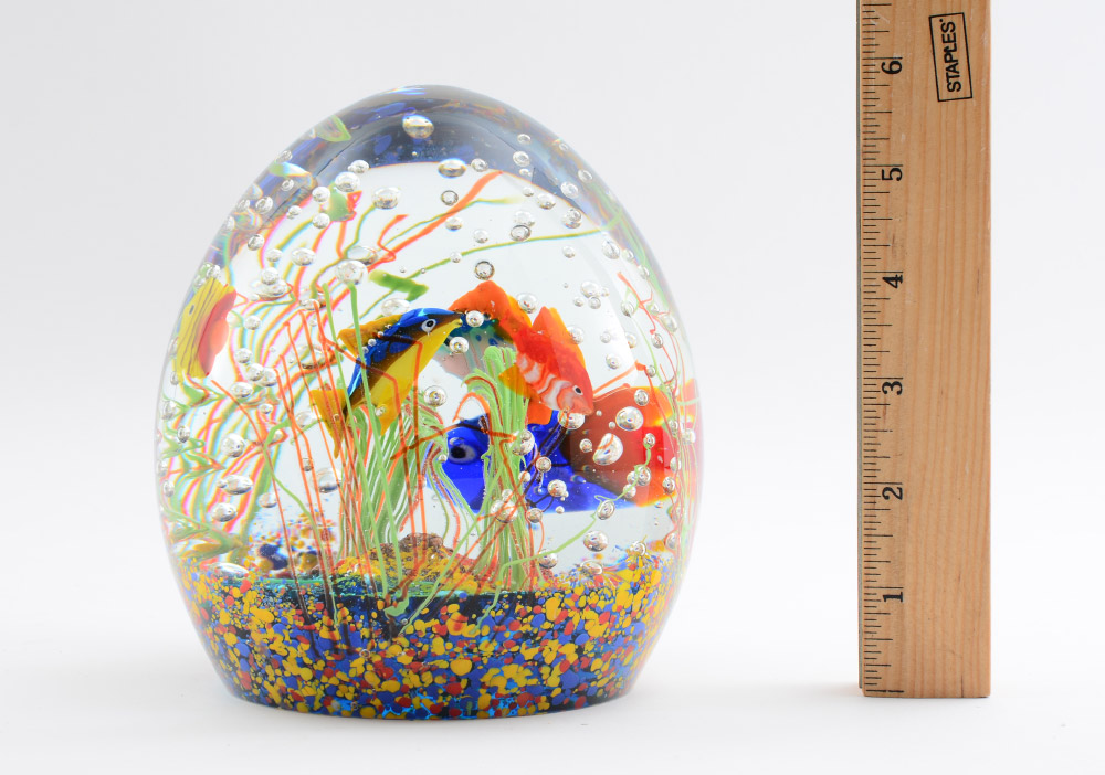 LARGE MURANO AQUARIUM PAPERWEIGHT: Ovoid form with tropical fish in underwater scene. Original Murano, Made In Italy foil tag underneath. Measures 6'' h. x 5''.