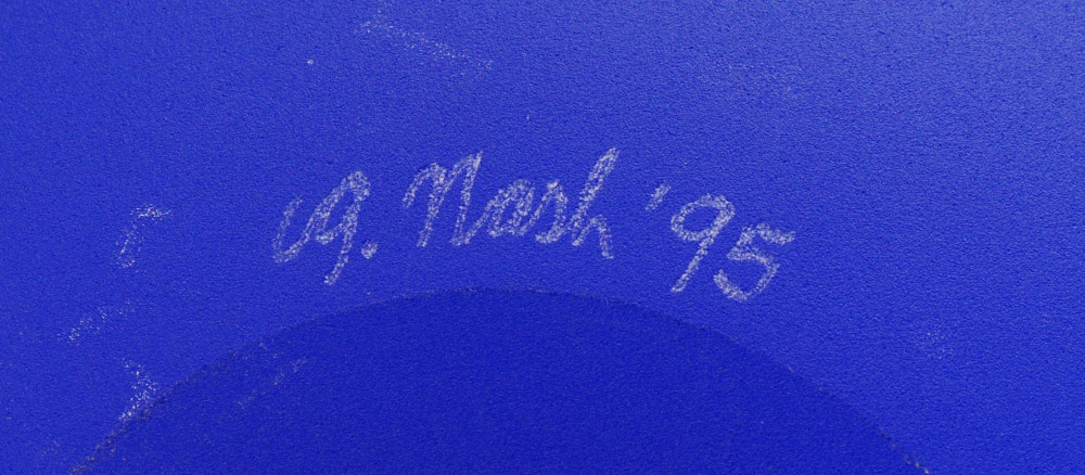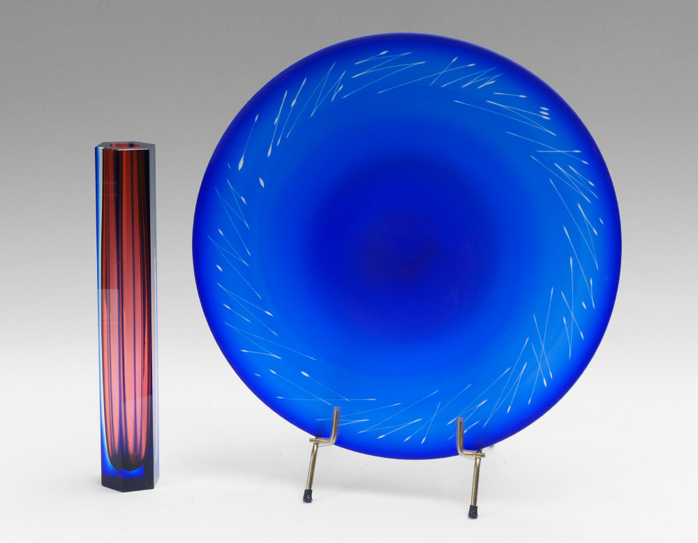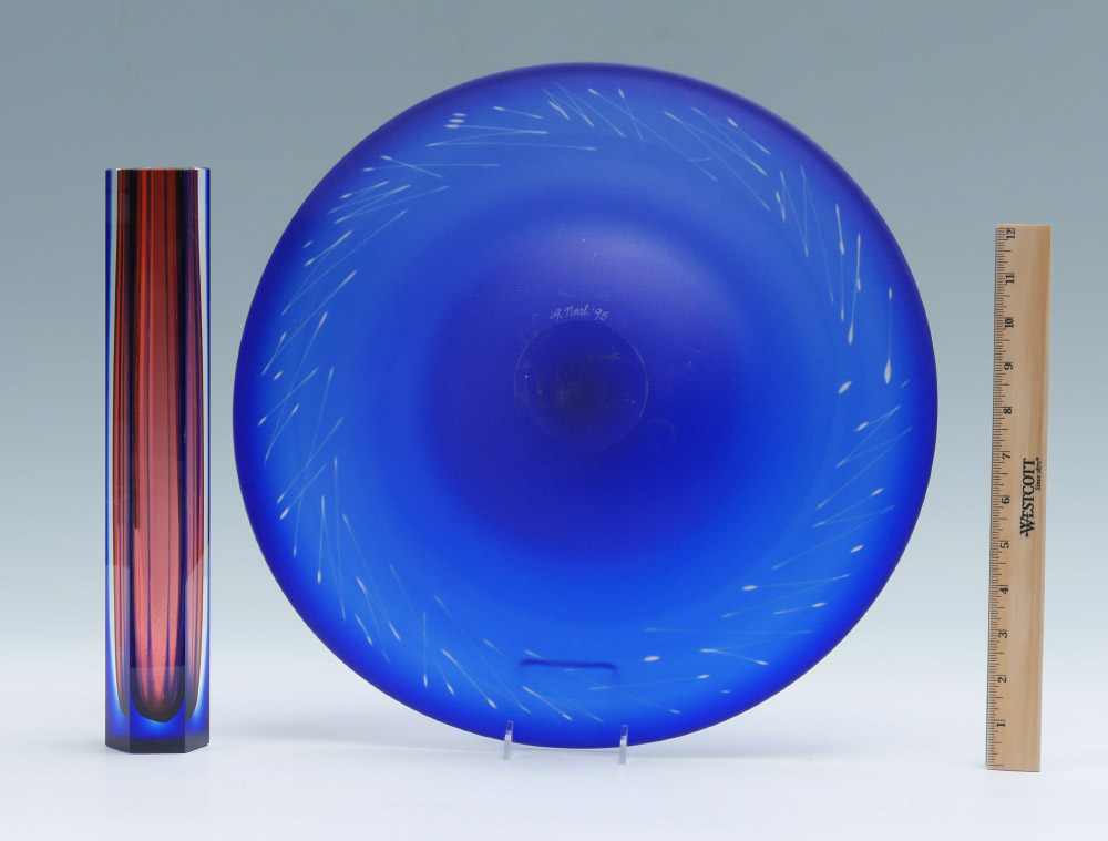 2 PIECE 20th C ART GLASS: 1) Garry Nash, New Zealand. Cobalt hand blown, sand blasted bowl, signed G Nash 95. 16'' dia. 2) Hadeland Glass Works, Norway. Sommerso technique, 13'' tall x 2'' dia. Signed Hadeland AJJ.