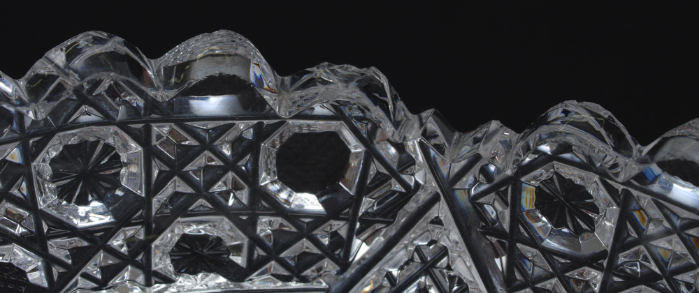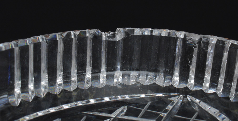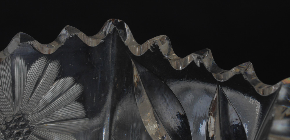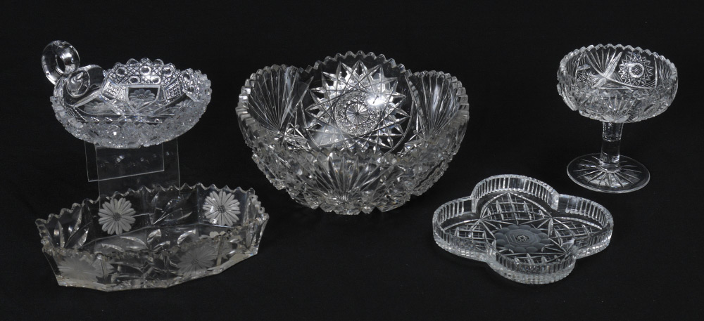 5 PIECE COLLECTION OF CUT GLASS: An assembled collection to include 1) Center bowl, 3 3/4'' h. x 9'' dia. 2) Single handle nappy, 2 3/8'' h. x 7''. 3) Sherbet, 4 1/2'' x 4 1/2''. 4) Open condiment, 1 3/4'' x 7 3/4'' x 5''. 5) Quatrefoil candy dish, 1'' x 5 1/2''.