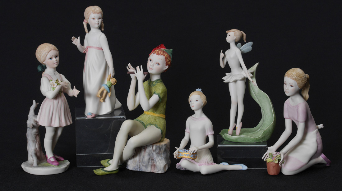 GROUP OF 6 CYBIS PORCELAIN FIGURINES: To include Peter Pan (7.5''), Tinkerbell, Wendy and 3 additional young girls. Measure 5'' to 8'' tall.