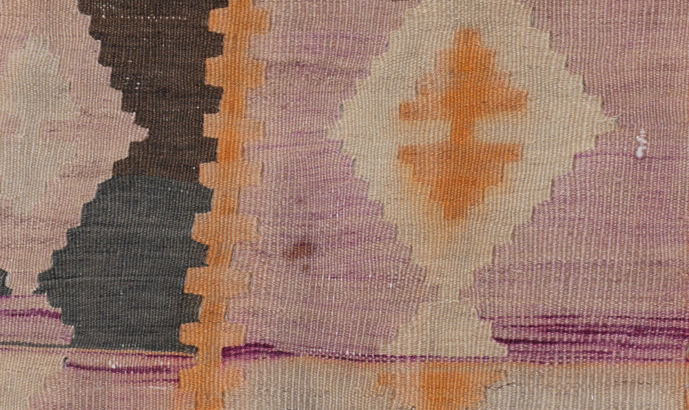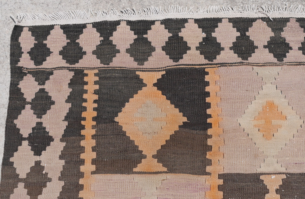APPROX. 20-45 YR. OLD KURDISH HANDMADE WOOL RUG, 4' x 9'6'': This rug has a strong tribal look with its geometric design of orange, white, and pale lavender diamonds in rows that are divided by vertical orange colored bands. Each diamond rests on a rectangular panel with a different color from the next.