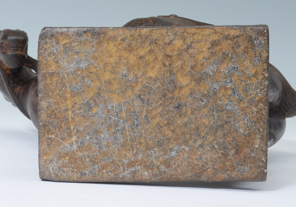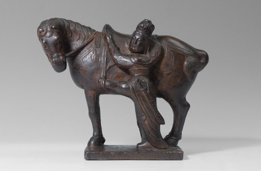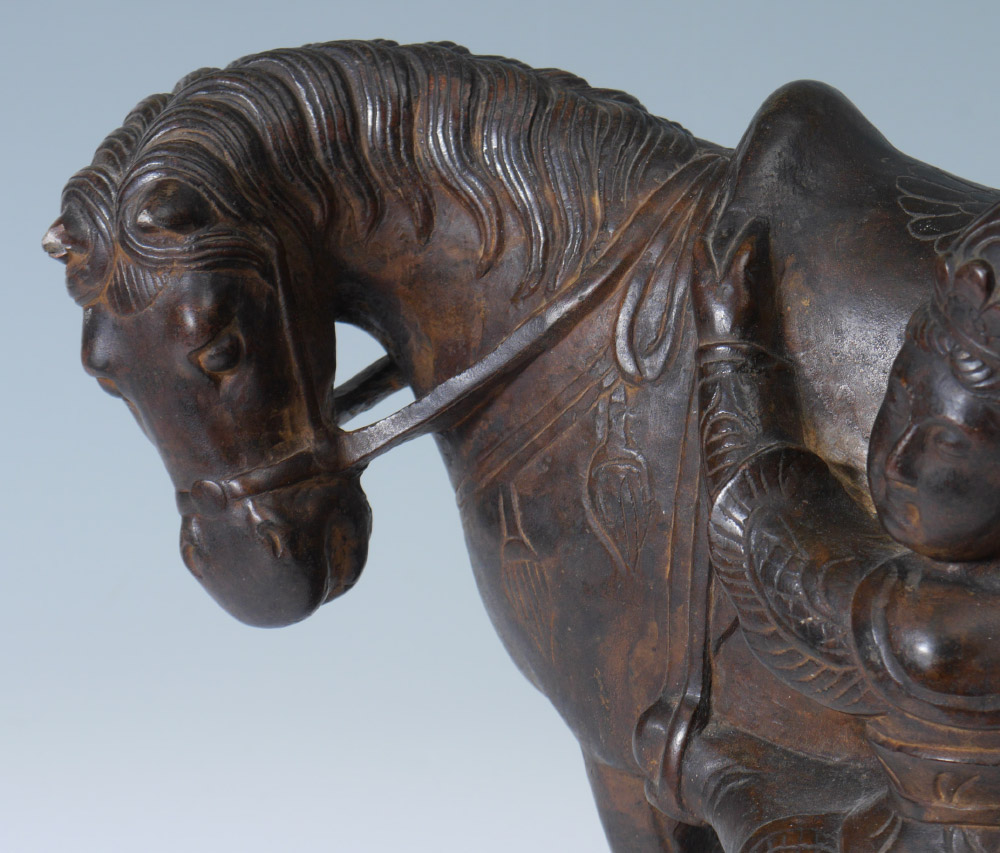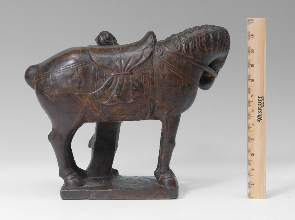 CHINESE STONE SCULPTURE HORSE AND RIDER: Carved stone figural group of a Chinese officer with sword climbing on a large horse. Overall measures 12'' h. x 14 1/2'' x 5 1/4''.