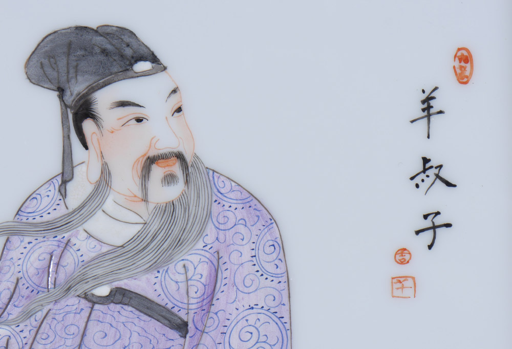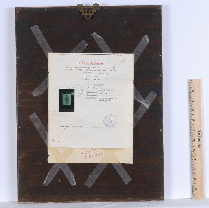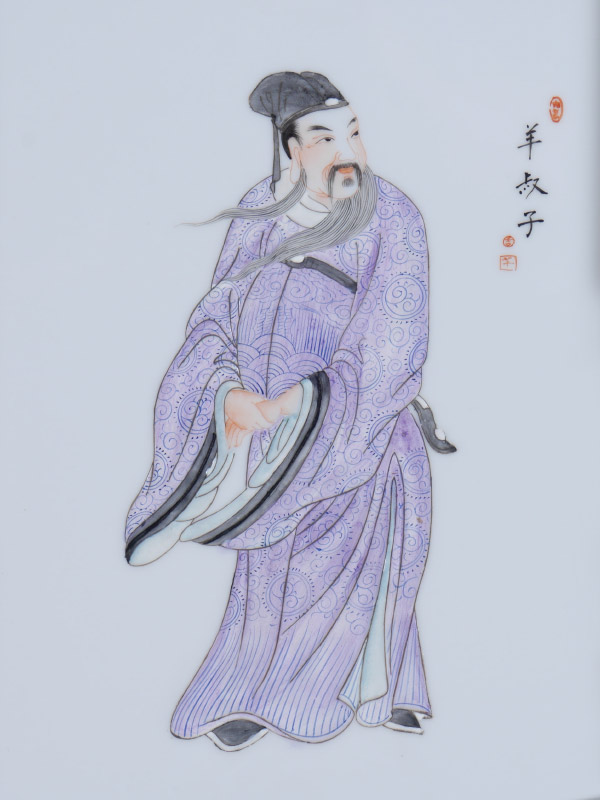 19TH CENTURY CHINESE PORCELAIN PLAQUE: Circa 1850-1870, hand painted and incised figure of a man in flowing robes, marked with characters, sight size 11 1/2'' x 8 1/2, framed 19 3/4'' x 14 1/2''.