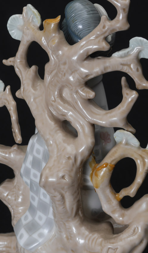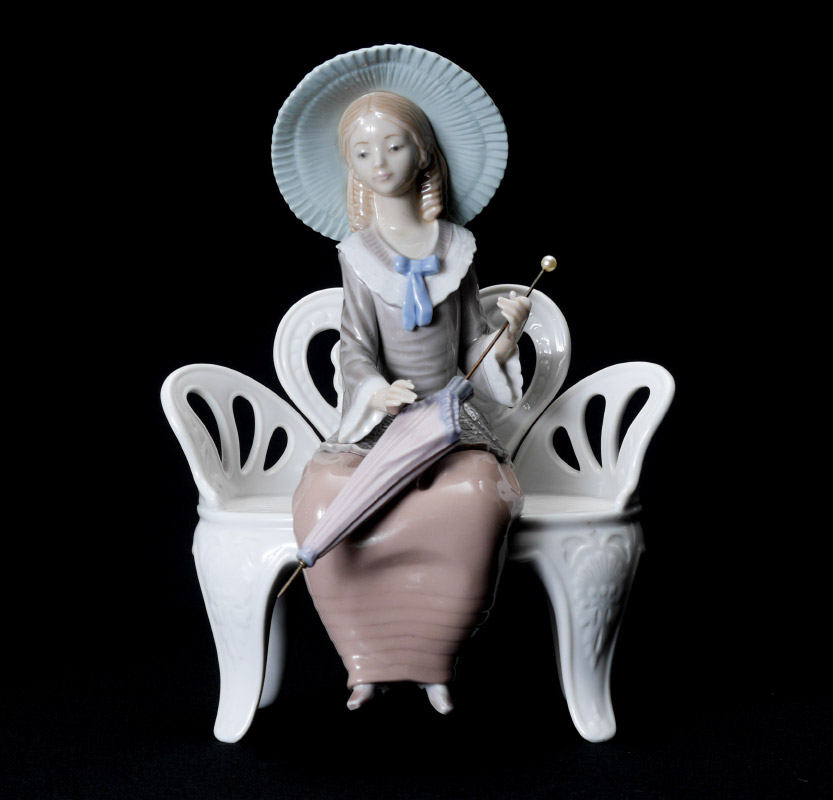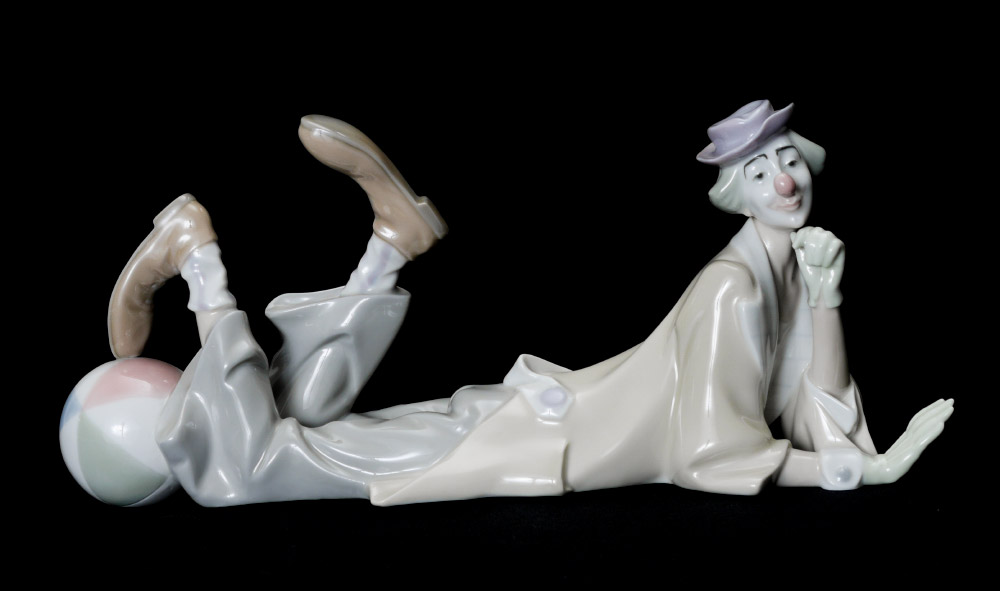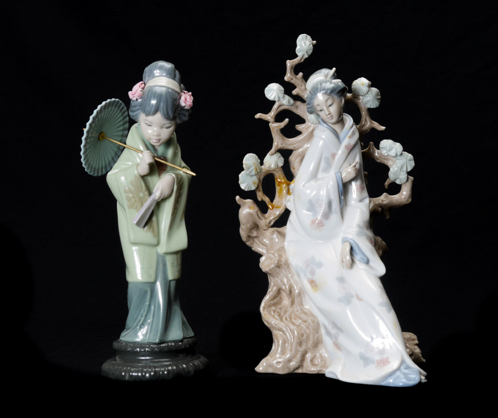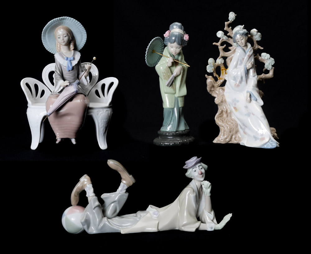 FOUR LLADRO PORCELAIN FIGURINES: Estate lot to include, CLOWN #4618, Salvador Furio sculptor, issued 1969 - active gloss finish, 6.25''h. x 13.75'' x 4.75''; GEISHA #4807, Vincente Martinez sculptor, issued 1972 retired 1993, 12.25''h. x 7'' x 8''. Missing fan, repair to tree plus missing upper branch.; ORIENTAL SPRING #4988, Salvador Debon sculptor, issued 1978 retired 1996, 11.25''h. Umbrella is loose in hand.; and WAITING IN THE PARK #1374, Francisco Catala sculptor, issued 1978 retired 1993, 10.25'' x 8'' x 6''.