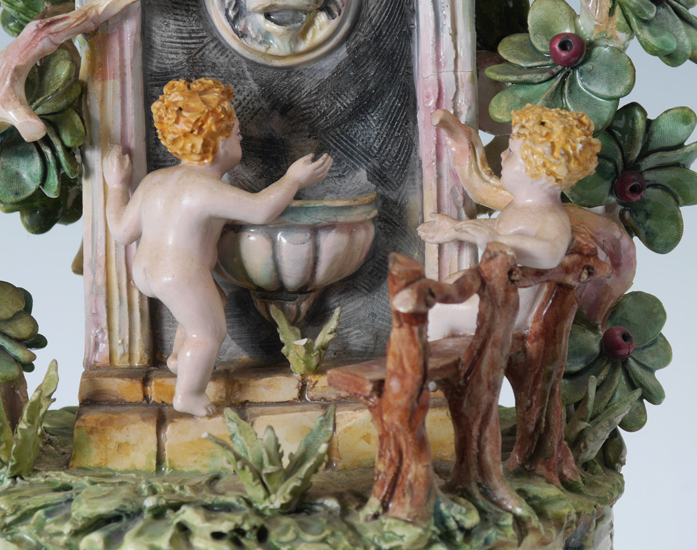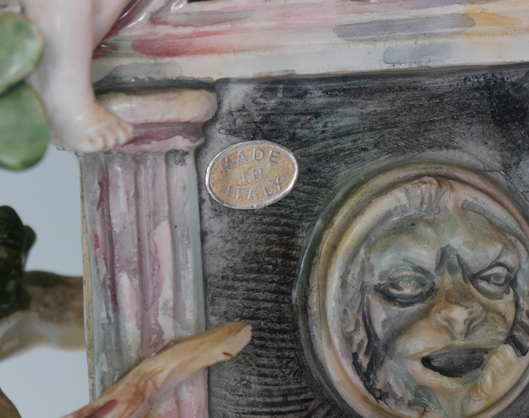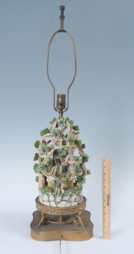CAPODIMONTE ITALIAN CERAMIC FIGURAL LAMP: A detailed study of putti at play at a lavabo nestled in a tree. Two tiered metal base, also with putti. Measures approx. 38'' tall, all inclusive.