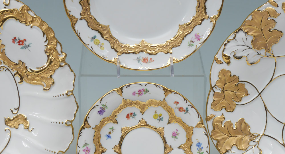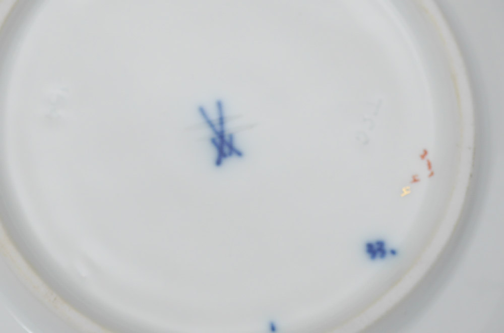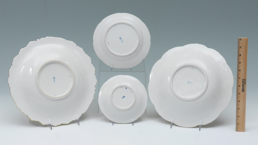 4 PIECE MEISSEN PLATES: An assembled collection of plates and low bowls, all with blue crossed swords seconds marks, to include 1) Gilt embossed oak leaf design low bowl, impressed 35V, C138, other marks, 2'' h. x 11 3/8''. 2) Floral and gilt embossed decoration low bowl, impressed 33-, F102, other marks, 2'' h. x 11 5/8''. 3) Salad plates with floral and embossed decoration, 7 3/4'' dia. 4) Saucer, impressed 53, 154, other marks, 6 1/2'' dia.