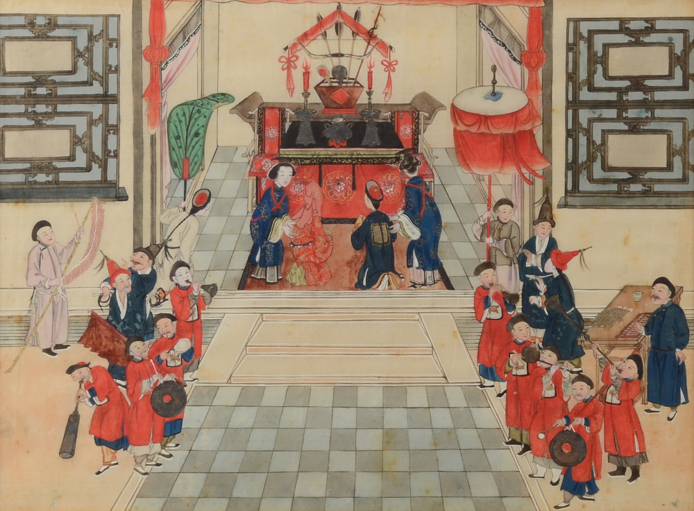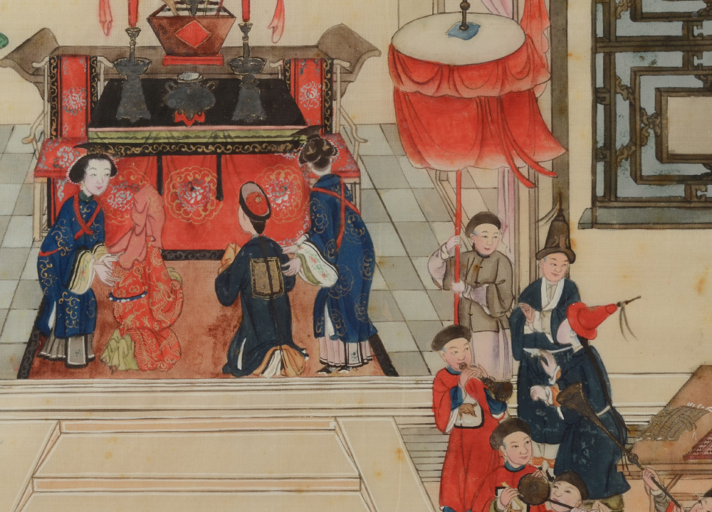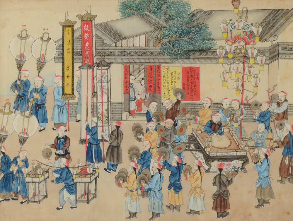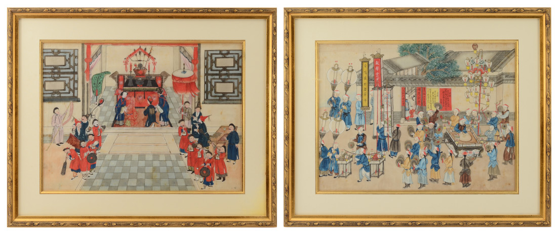 PAIR OF ORIENTAL PAINTINGS DEPICTING FESTIVALS: Watercolor/Fabric or Silk, sight size 11 3/4'' x 15 3/4'', matching frames, 17 1/2'' x 21 1/2''.