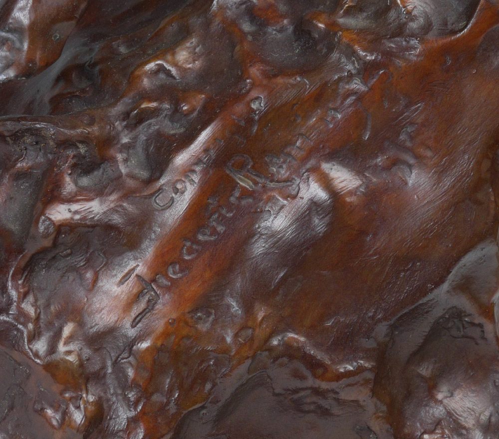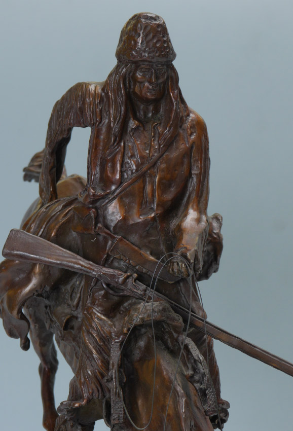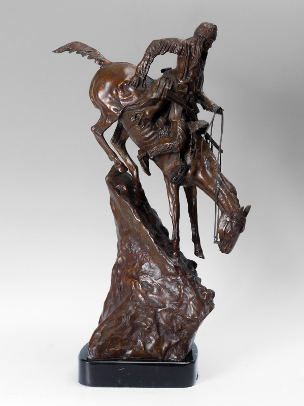 OLDER REMINGTON RECAST MOUNTAIN MAN BRONZE: 26'' h., 28''h. x 17'' x 11'' overall with marble plinth.