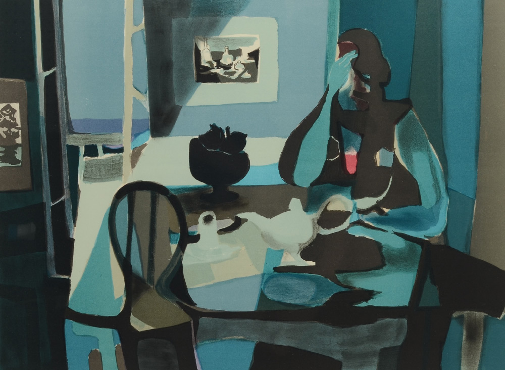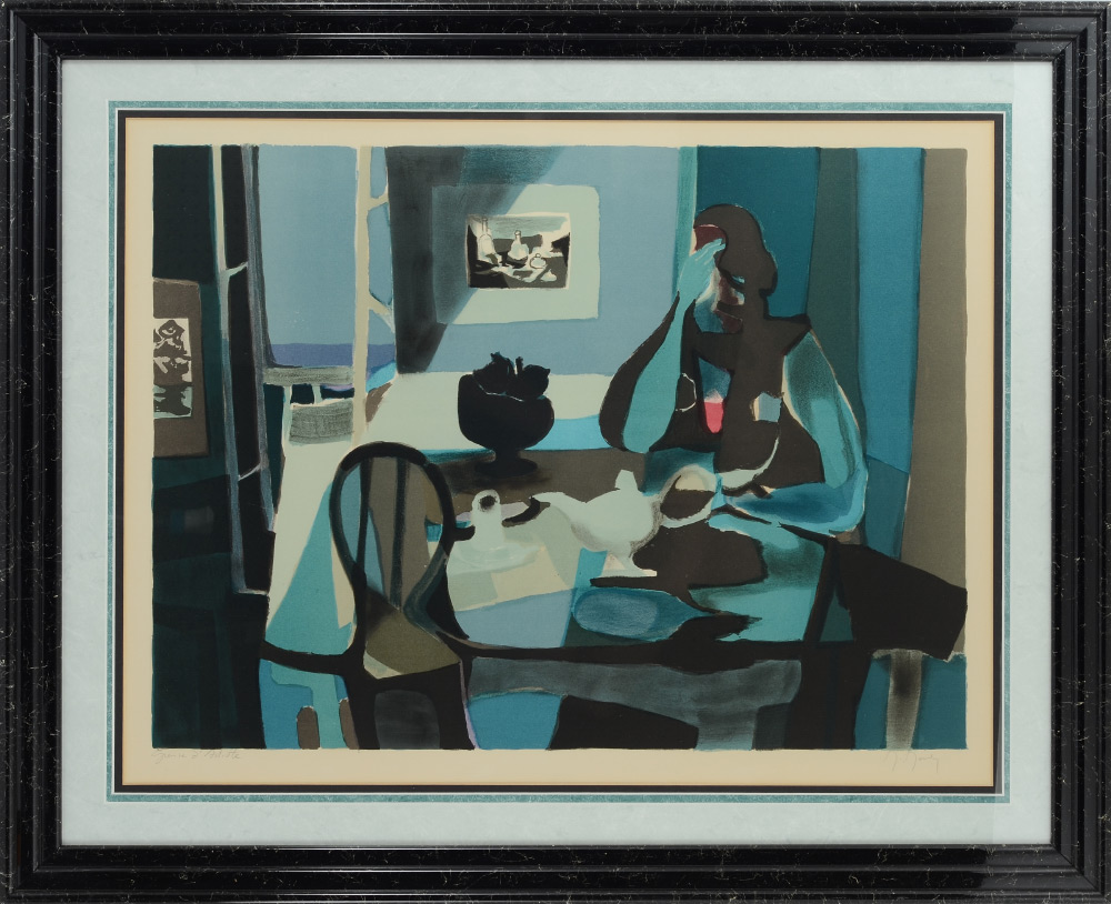MOULY, Marcel, (French, 1918-2008): Interior Scene with Figure at a Table, Lithograph, sight size 20'' x 25 1/2'', pencil signed lower right, marked ''Artist Proof'' lower left in French, custom framing, 27'' x 33''.