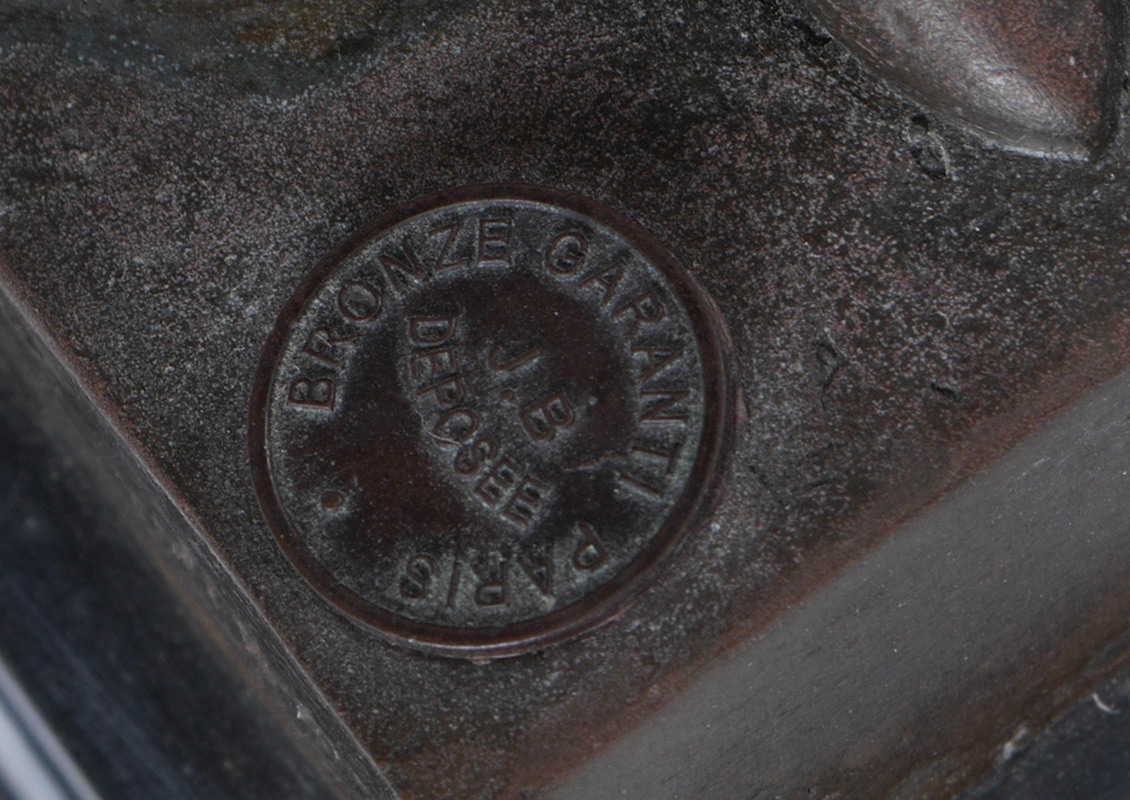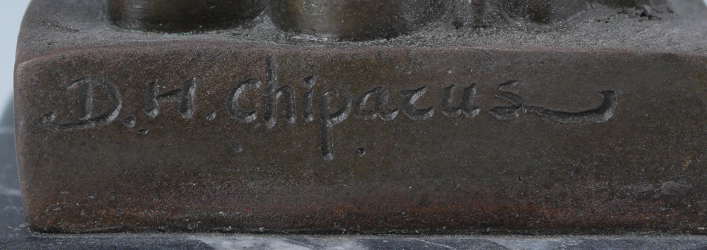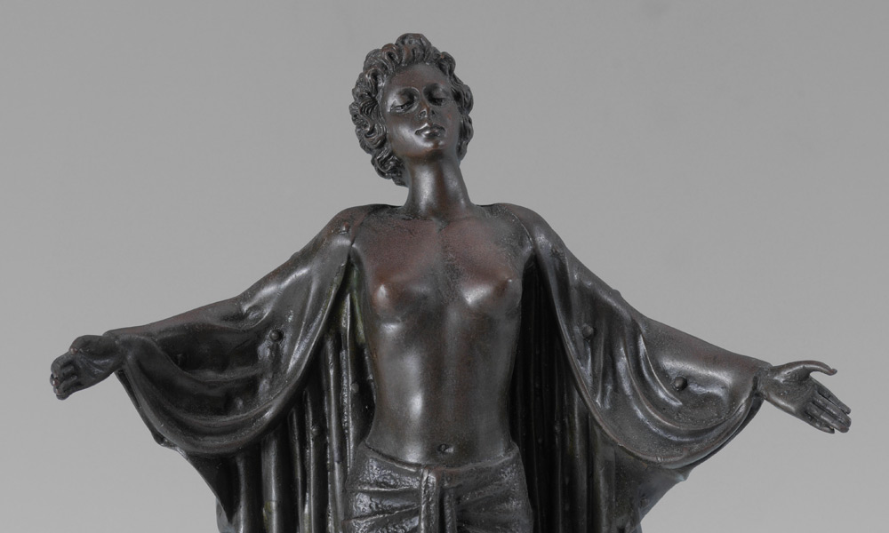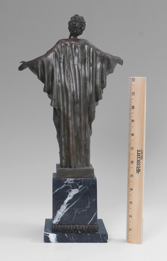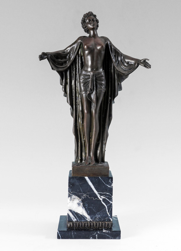 BRONZE NUDE DECO STATUE AFTER CHIPARUS: Young topless female nude draped in robe, arms outstretched, 12 1/2'' h., 17 1/4'' with marble plinth, incised signature, foundry mark.