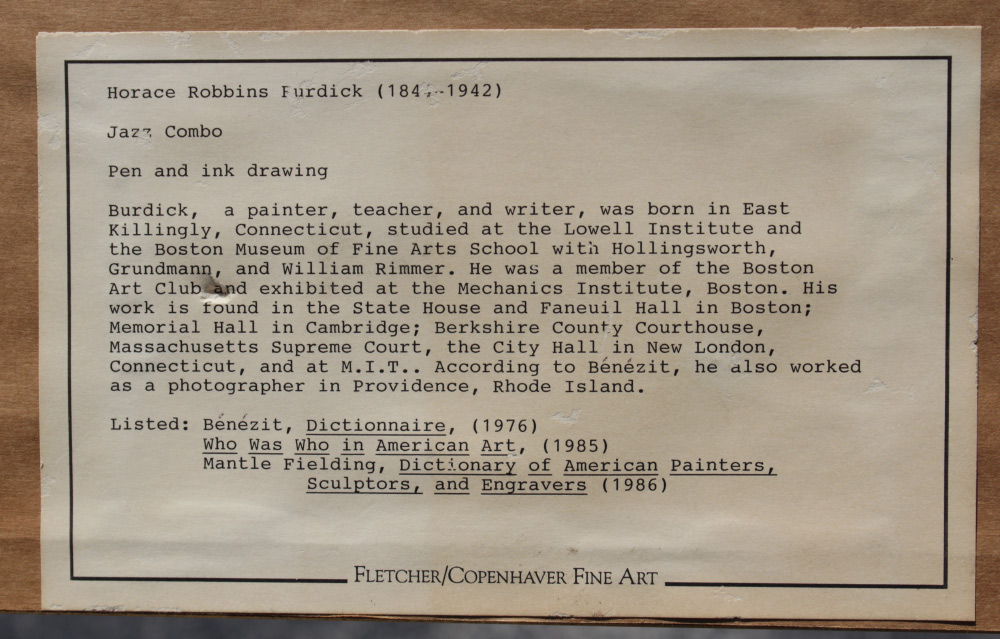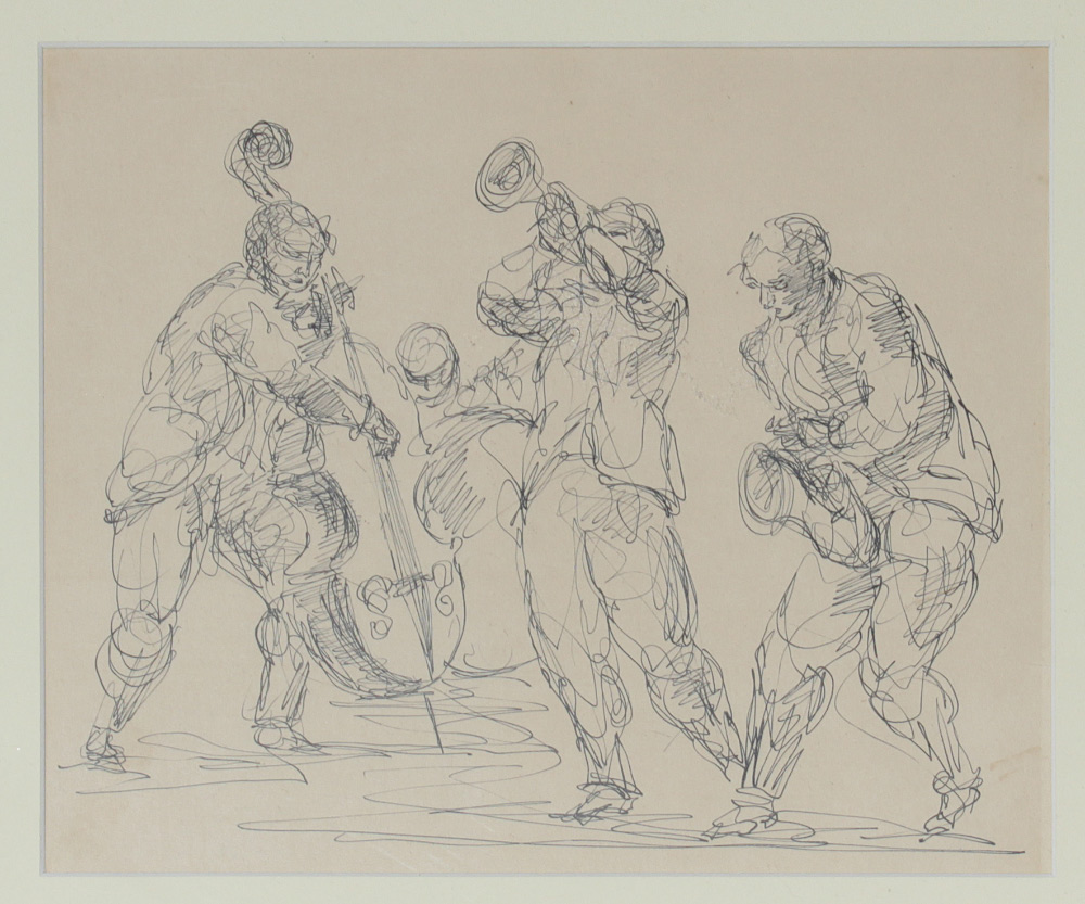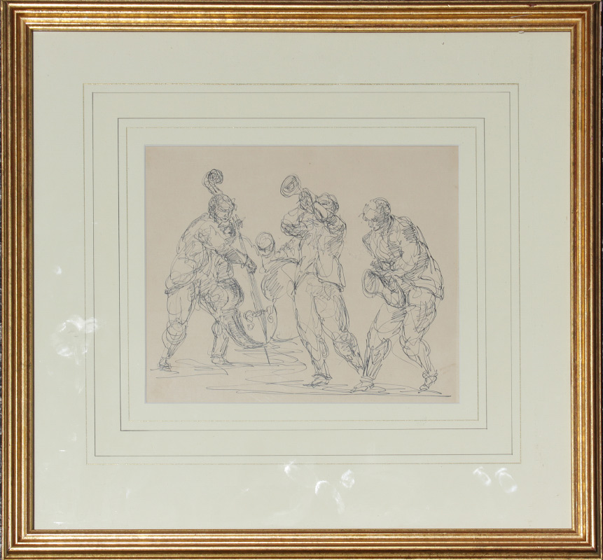 BURDICK, Horace Robbins, (American 1844-1942): ''Jazz Combo'', Pen/Ink, sight size 7 1/2'' x 9 1/2'', framed, 16 1/2'' x 17 1/2'', Fletcher/Copenhaver Fine Art label affixed verso.