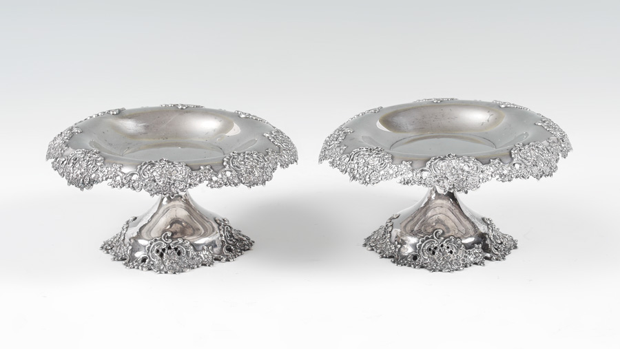 PAIR TIFFANY & CO. STERLING RETICULATED COMPOTES: Pair with downturned floral motif pierced rims, flared foot with matching floral motif, marked inside ''Tiffany & Co., 13838 Makers 5722, Sterling silver, 925-1000''. 3 3/4'' h. x 8'' dia., approx. 26.8 troy oz.
