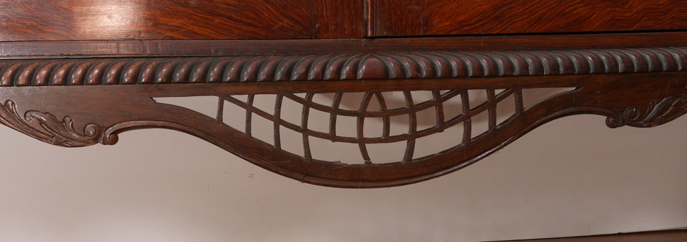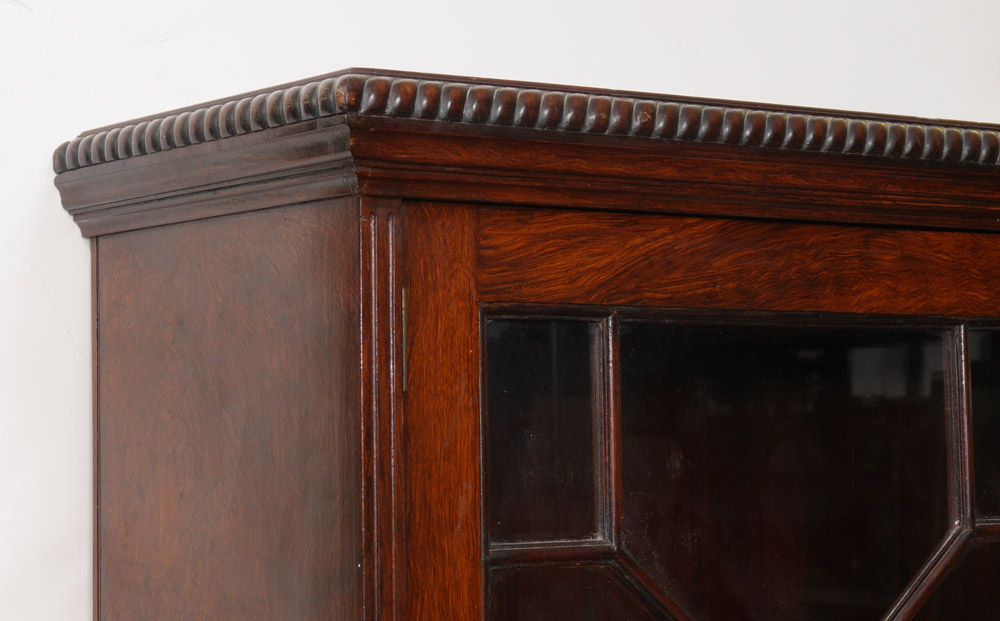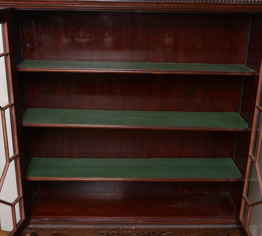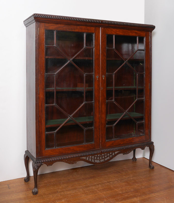 ENGLISH CHIPPENDALE STYLE MAHOGANY BOOKCASE: 2 glass front doors with fretwork, gadroon trim top and bottom, carved and shaped feet, 3 internal shelves. Pierced shaped skirt. Overall measures 67 1/2'' h. x 58 1/2'' x 15''.
