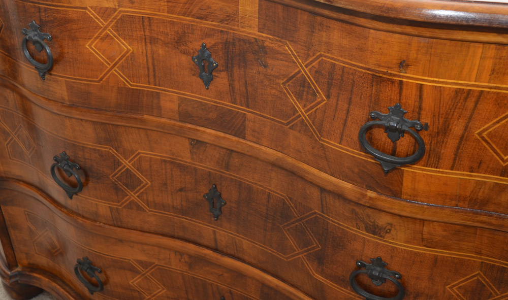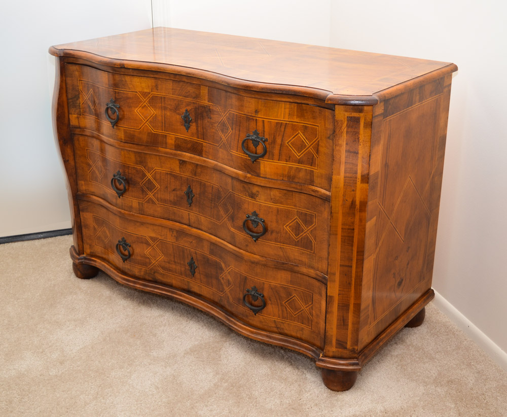 3 DRAWER INLAID SERPENTINE DRESSER: Serpentine top and front, geometric parquetry inlaid all over, 3 full length drawers. 31 1/2'' h. x 44 3/4'' x 21''.