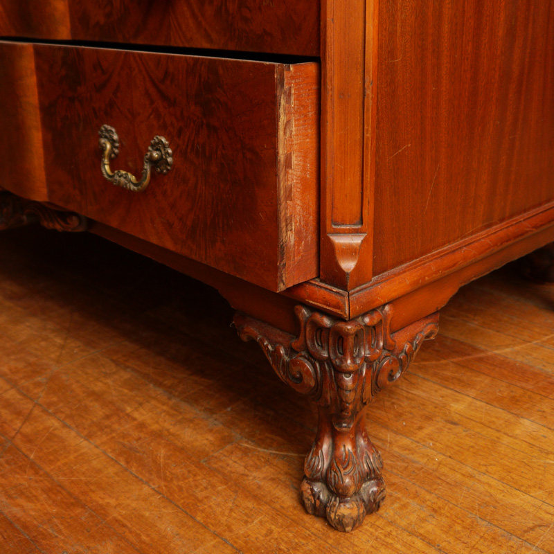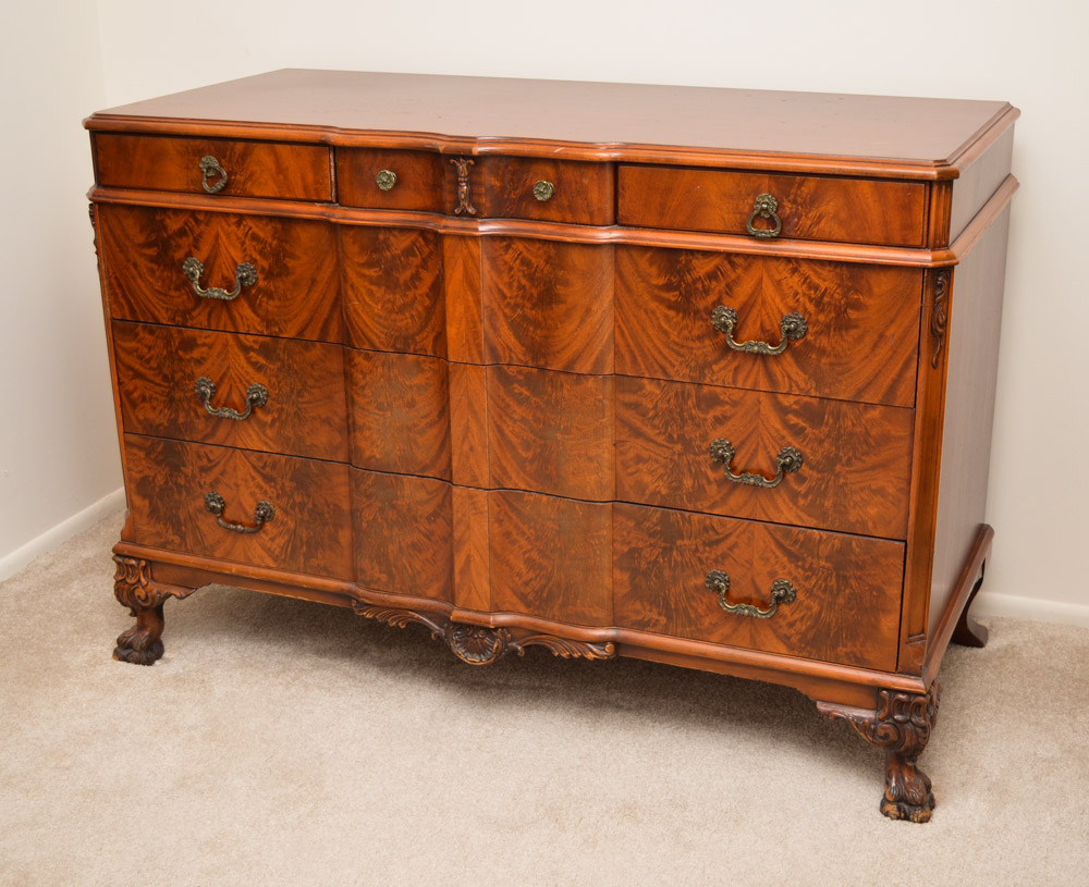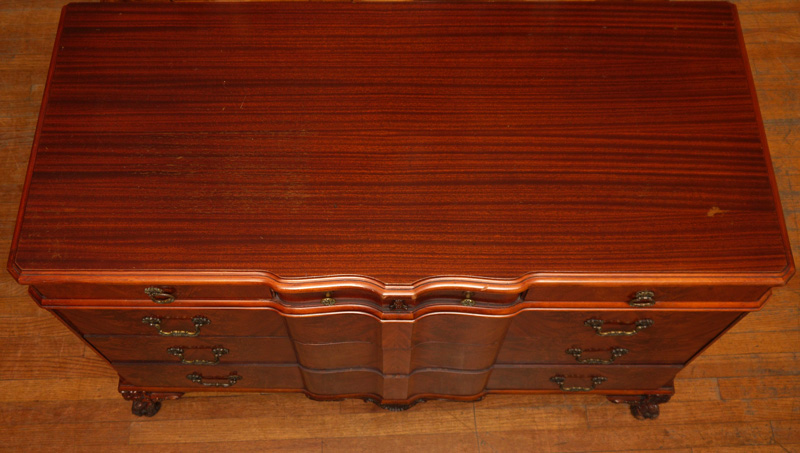 CROTCH GRAIN MAHOGANY CHEST OF DRAWERS: Shaped top and front, richly grained mahogany, 3 drawers over 3 full length drawers, canted corners, carved front legs. Overall 34 3/4'' h. x 49 1/2'' x 22 3/4''.