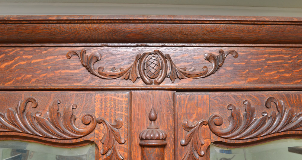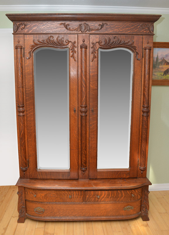 CARVED GOLDEN OAK ARMOIRE: Pediment with applied carved foliate decoration, 2 doors with matching decoration and shaped beveled glass mirrors. Applied half columns, interior with shelves. Base with 2 half drawers over full length drawer, overall measures 82'' h. x 54'' x 16''.