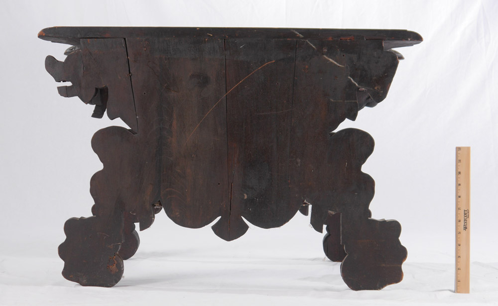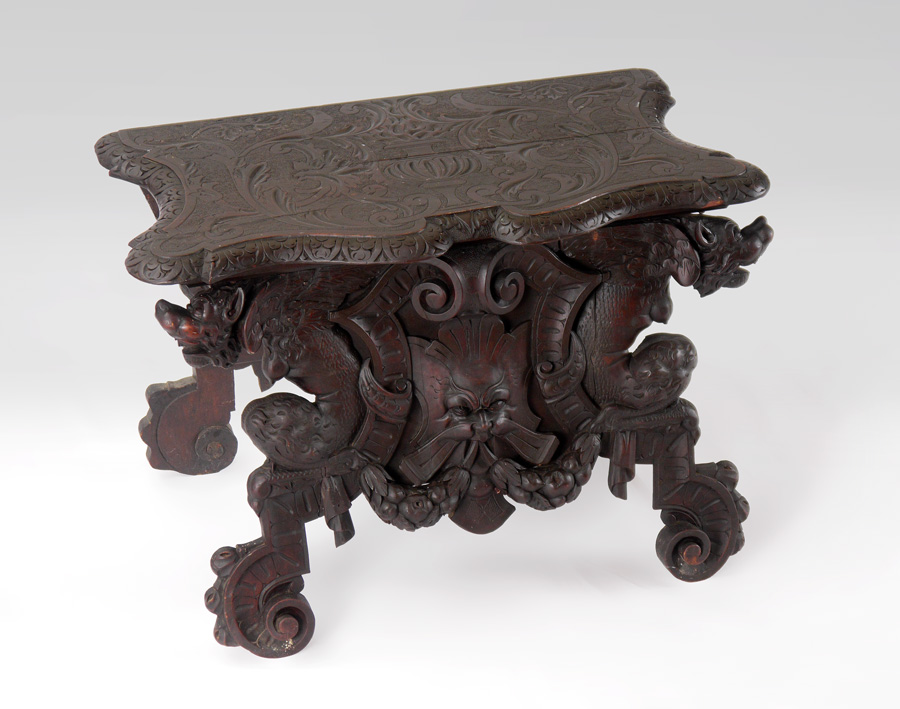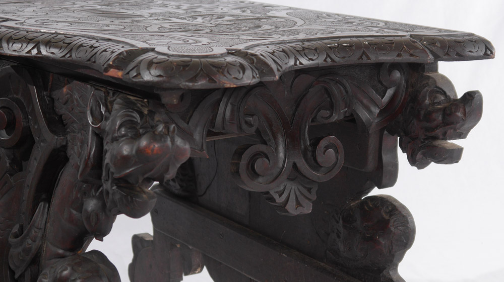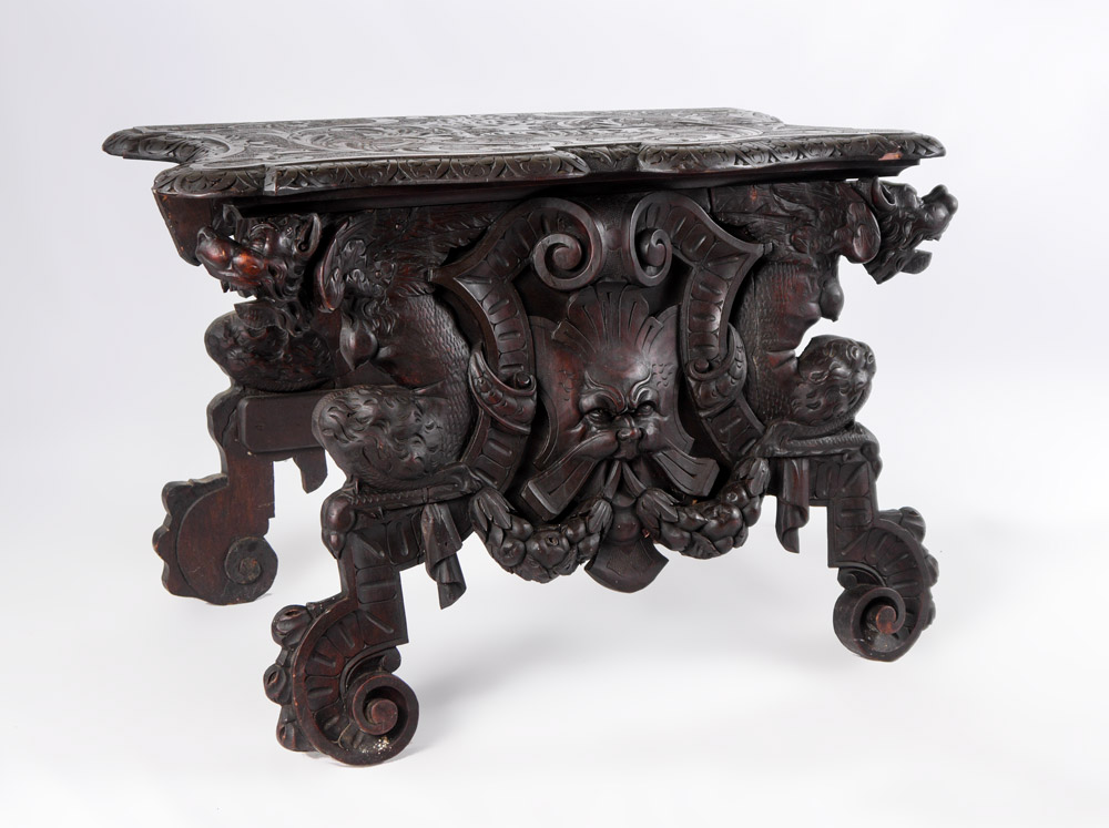 CONTINENTAL CARVED NORTHWIND FIGURAL OCCASIONAL TABLE: Carved and shaped top, front support profusely carved with Northwind masqueron, creature heads and foliate scroll, shaped back support. Overall measures 22'' h. x 34'' x 20''.