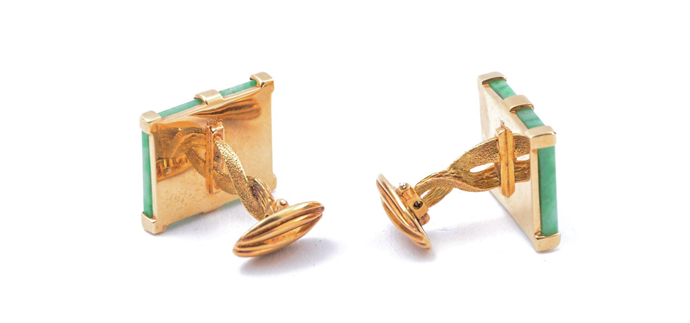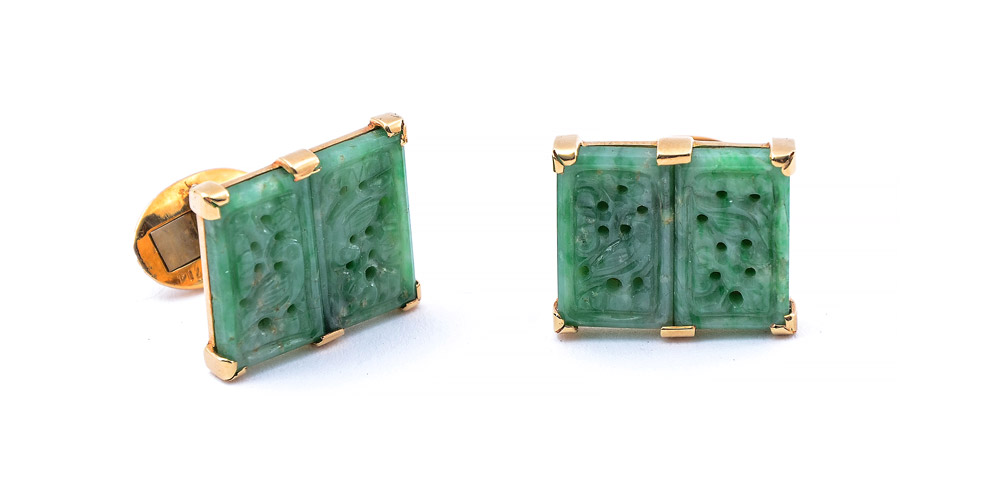 18K JADE CUFF LINKS: 18K yellow gold cufflinks with pierced and carved jade tablets. Jade measures approx. 7/8'' x 5/8''. Weight: 24.3 grams.