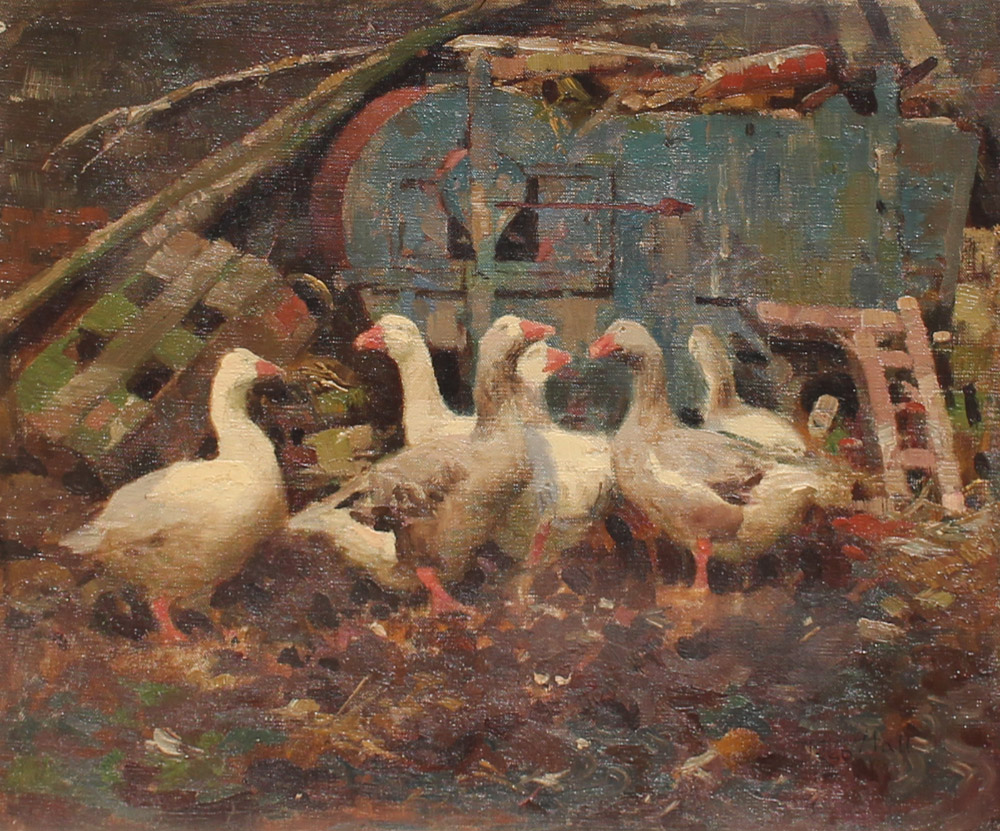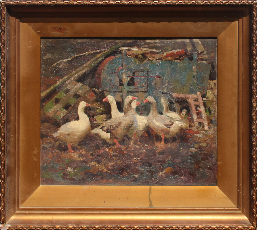 HALL, Frederick, (British, 1860-1948): Geese in Barnyard, Oil/Canvas Board, 13'' x 16'', signed lower right, framed, 19.25'' x 22.25'', Christie's label affixed verso.