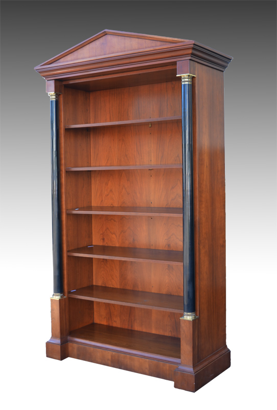 BIEDERMEIER STYLE BOOKCASE BY BAKER FURNITURE: Architectural pediment, ebonized full columns, 5 adjustable shelves, open front. Baker Furniture tag on back, overall measures 82'' h. x 46 1/4'' x 19 3/4''.