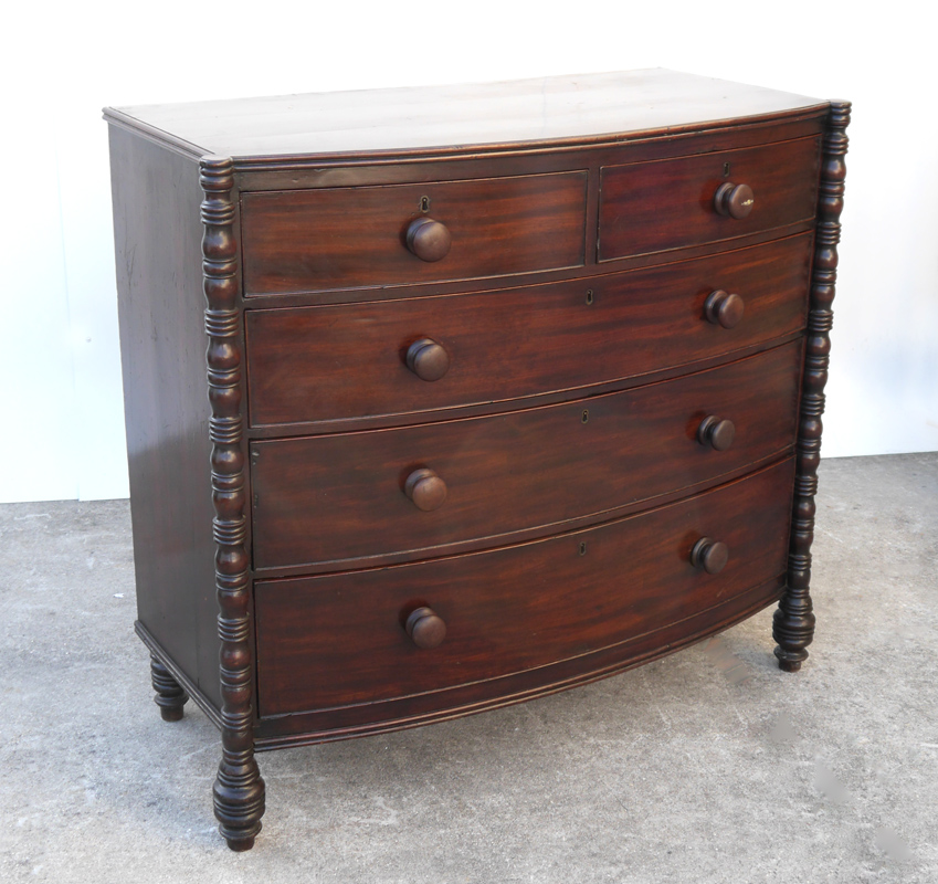 EARLY SHERATON STYLE MAHOGANY CHEST OF DRAWERS: Slightly bowed front, 2 half drawers over 3 full length drawers, turned stiles and feet. Overall measures 41 1/2'' h. x 44 1/2'' x 21 1/2''.