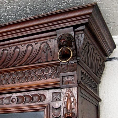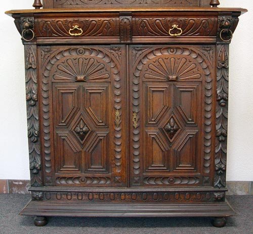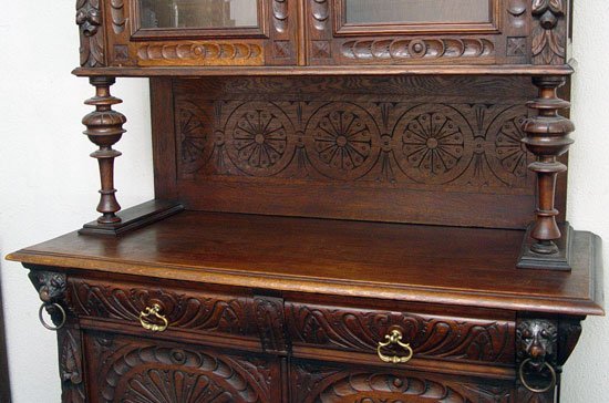 BELGIUM ORNATELY CARVED SIDEBOARD CUPBOARD: Fabulously carved walnut cupboard. Pair of ring nose lions guard the upper glass door cabinet. Relief geometric carvings and fruit and leaf carving throughout. Top and bottom pieces separate for shipping. Measures 93 1/2'' high overall x 44 1/4'' wide x 20'' deep.