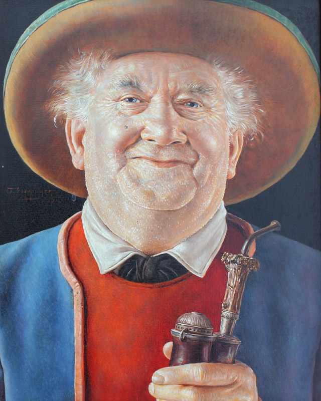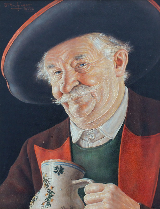 EICHINGER, Otto, (Austrian, 1922-2004): 2 Paintings. 1) A Smiling Gentleman Holding a Pipe, Oil/Board, 10'' x 8'', signed left margin and marked Wien, framed 17'' x 15.25''. 2) A Smiling Gentleman Holding a Jug of Drink, Oil/Board, 10'' x 8'', signed upper left and marked Wien, framed, 17'' x 15.25''.