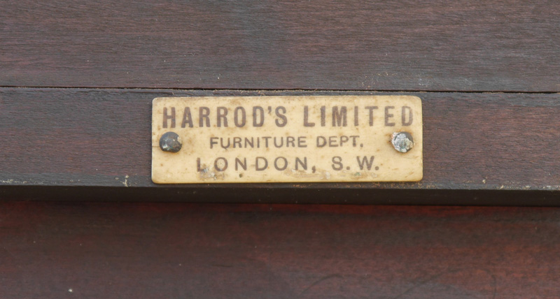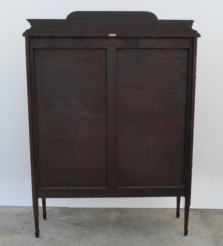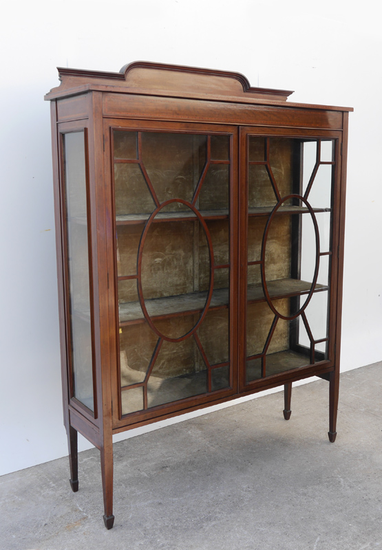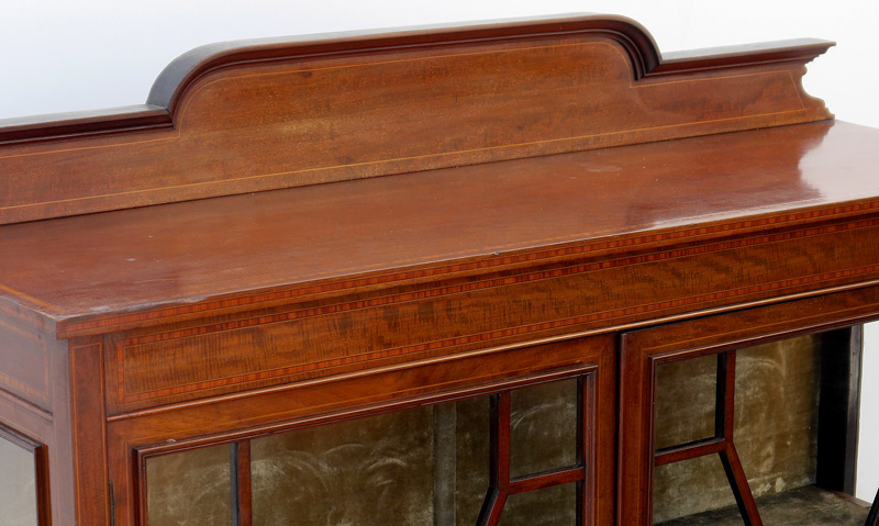 HARRODS ENGLISH INLAID MAHOGANY BOOKCASE: Shaped pediment, mahogany case with banded and string inlay, 2 glass door front with fretwork, green felt lined interior, tapered legs. Old Harrods tag on back. Overall 66 1/4'' h. x 48'' x 15''.