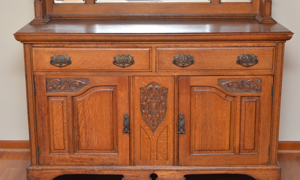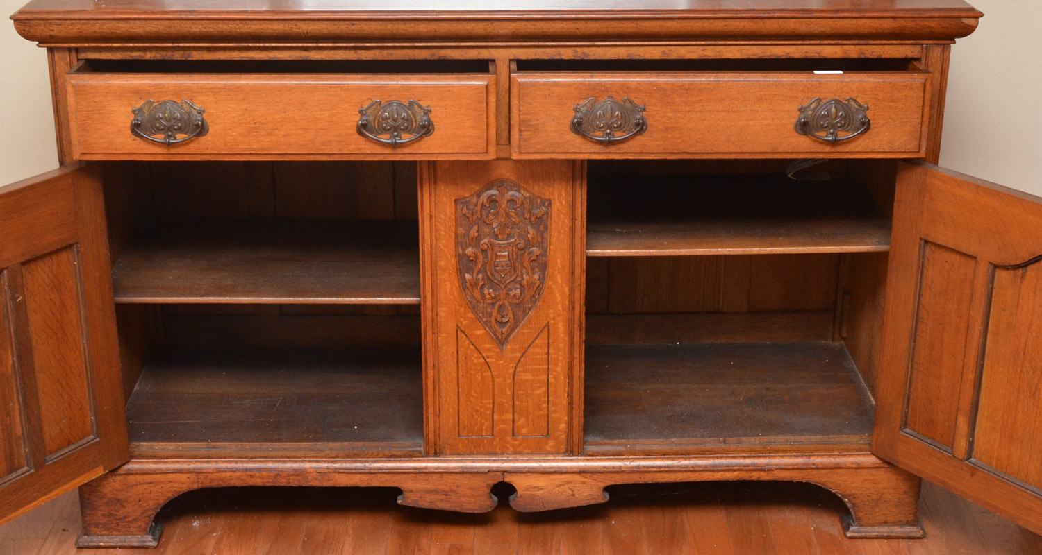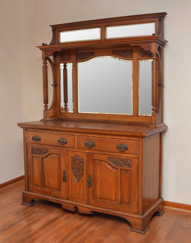 VICTORIAN CARVED OAK SIDEBOARD: Dentil molding over 2 beveled glass mirrors, open shelf. Back with carved panels, shaped beveled central mirror, side mirrors, fluted supports. Base with 2 drawers over 2 doors with single interior shelf, shaped skirt. Overall 84 1/4'' h. x 59 3/4'' x 22 1/2''.