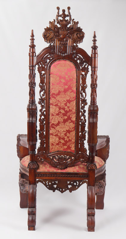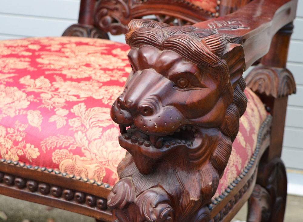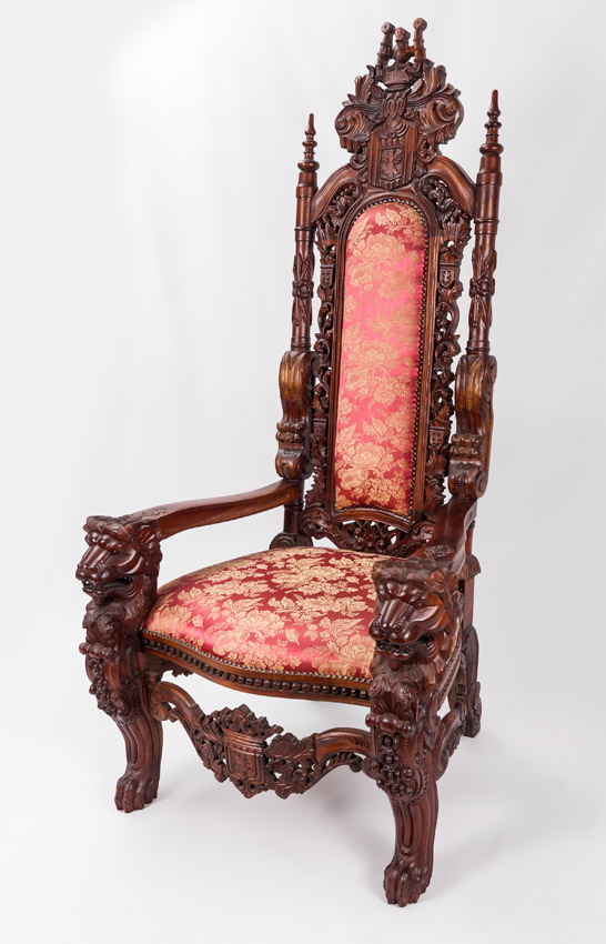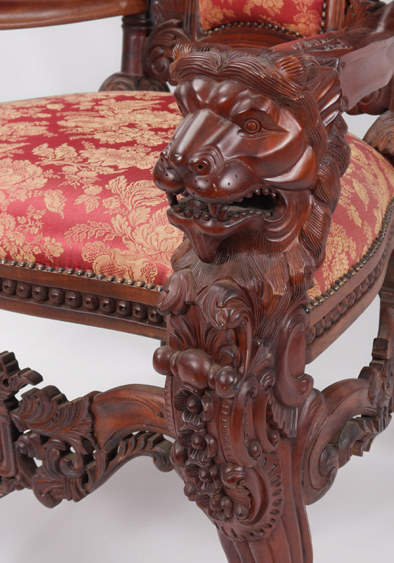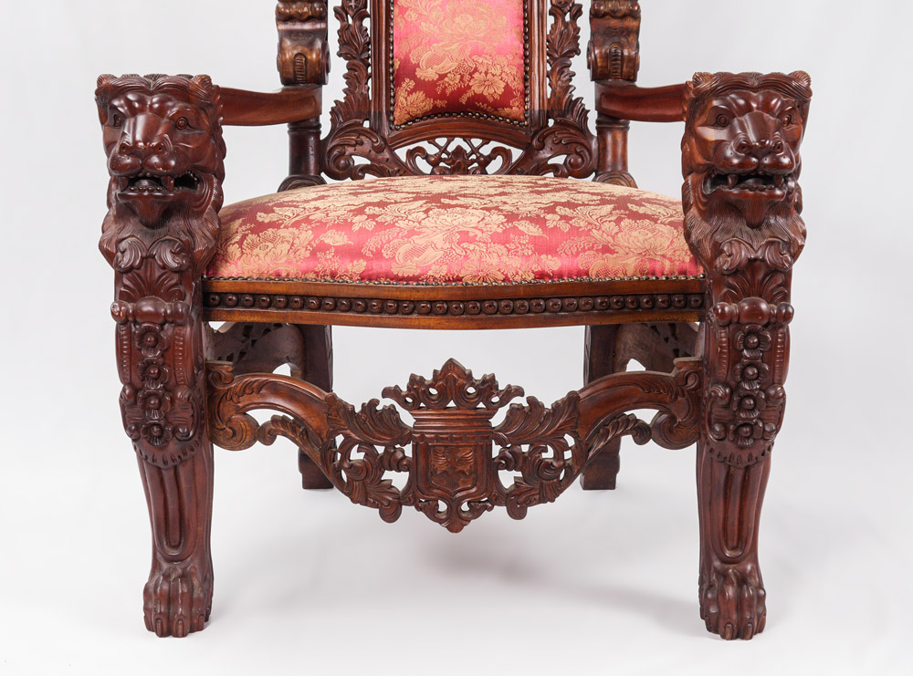 PALATIAL CARVED LION'S HEAD THRONE CHAIR: 20th century production, profusely carved all over with heraldic shields, floral and foliate motifs, stand of arms, lion head masquerons, ending in paw feet. Burgundy floral pattern upholstery, approx. 70 1/2'' x 36'' x 32''.