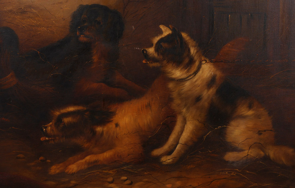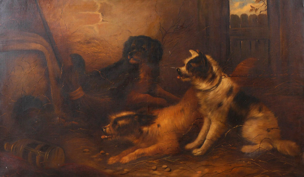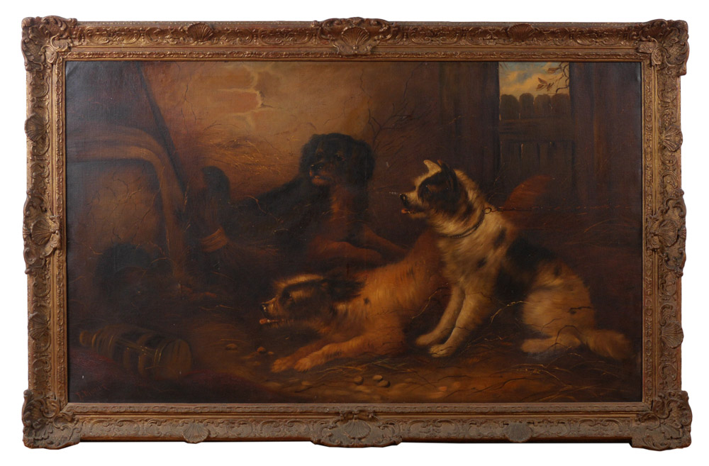 LARGE ILLEGIBLY SIGNED TERRIERS RATTING PAINTING: After Edward Armfield's ''Three Terriers in a Barn'', Oil/Canvas, 30'' x 50'', gesso frame, 36.5'' x 56.5'', signed illegibly lower left.