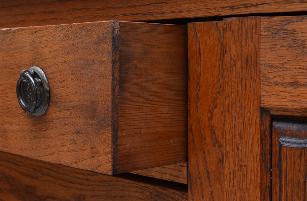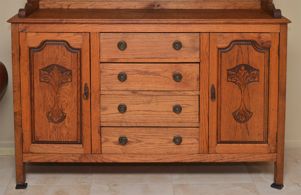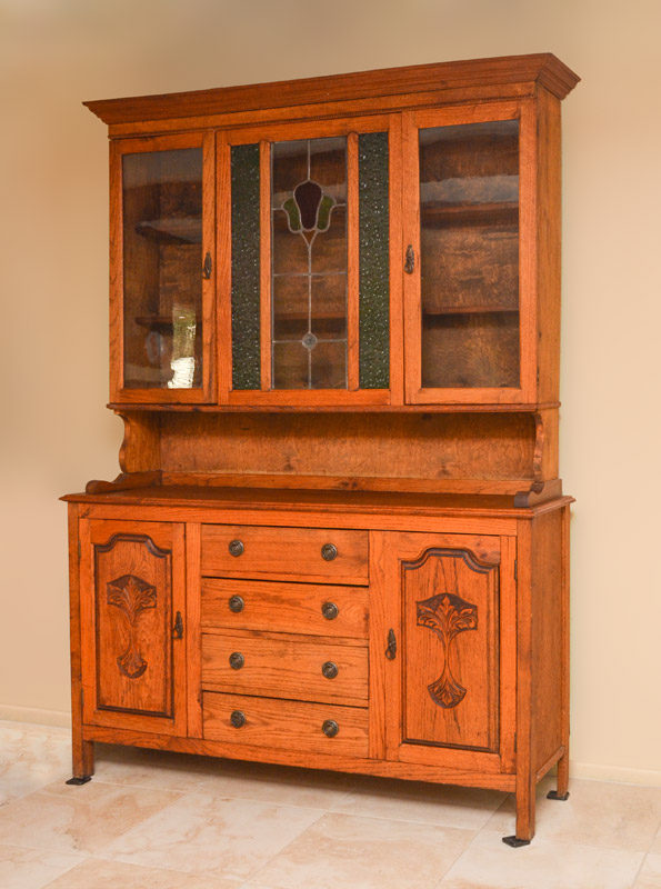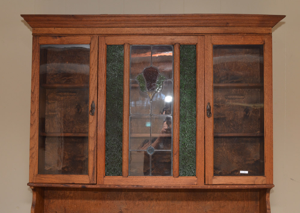 OAK LEADED GLASS CUPBOARD: Stepped pediment, leaded glass center with embossed green side panels, glass door either side, 2 interior shelves with plate rails. Base with 4 central drawers, door either side with carved panels, overall 84 1/2'' h. x 59 1/4'' x 16''.
