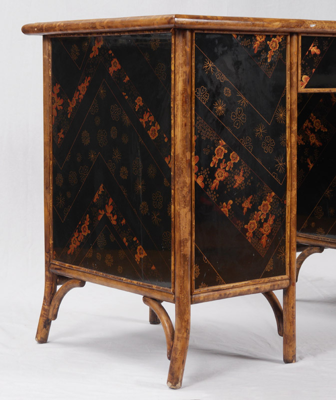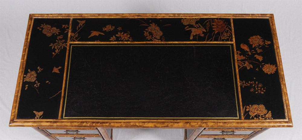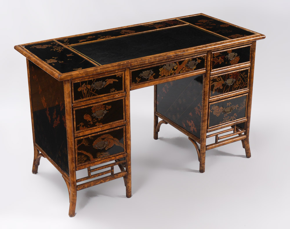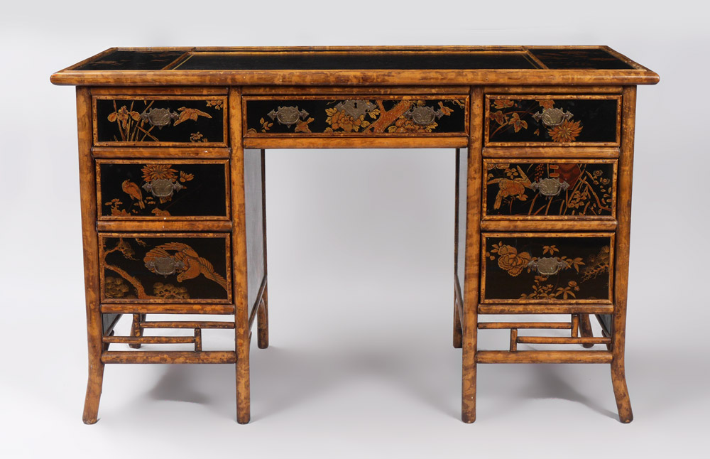 ORIENTAL STYLE CHINOISERIE KNEEHOLE DESK: Top with inset embossed leather writing surface, panels of chinoiserie decorated on glossy black lacquer, faux bamboo trim. Single central drawer, 3 drawers either side, Chinoiserie decoration continuing all over. Mid to late 20th century production, overall 32 1/2'' h. x 52 1/2'' x 24 1/2''.