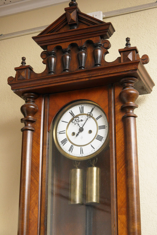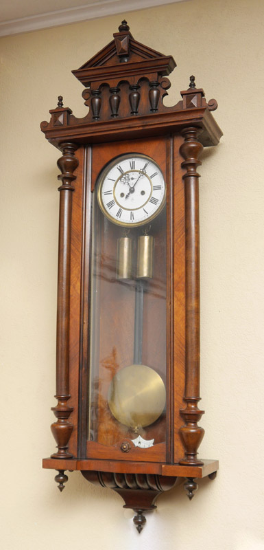 GUSTAV BECKER GERMAN DUAL WEIGHT REGULATOR CLOCK: Removable architectural pediment, porcelain dial with Roman numerals, marked with Gustav Becker anchor mark. Dual weight time and strike movement, overall measures 47'' h. x 17 1/4'' x 7 1/4''.
