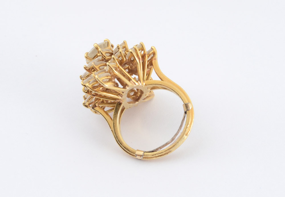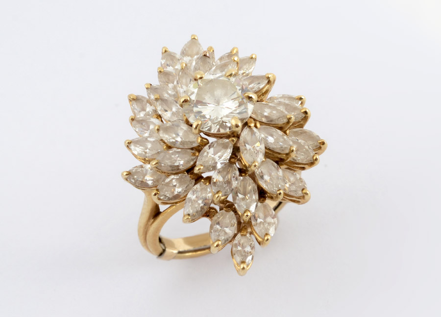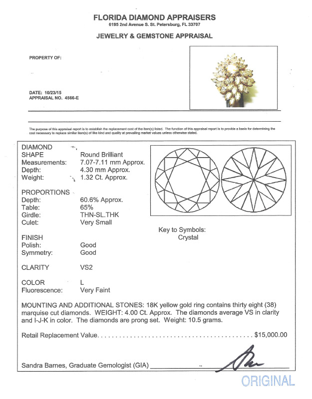 CLASSIC DIAMOND PRINCESS RING: 18K yellow gold ring featuring the 1.32 Ct round brilliant center diamond of VS2 clarity and L color, resting on a bed of 38 marquise cut diamonds totaling 4.0 Ct., averaging VS in clarity and I-J-K color. Size 4. Sold with current Florida Diamond Appraisers GIA graduates appraisal for $15,000.
