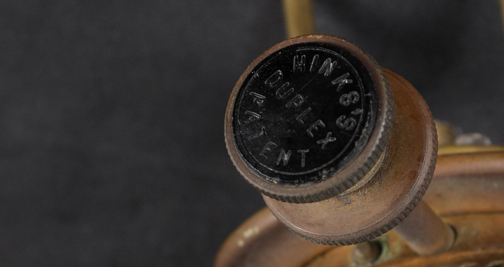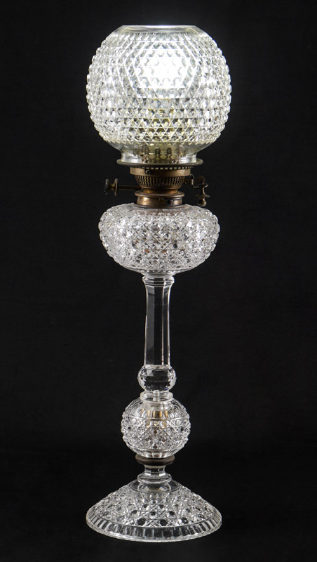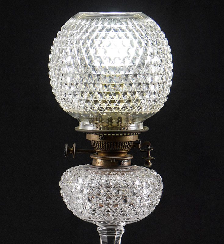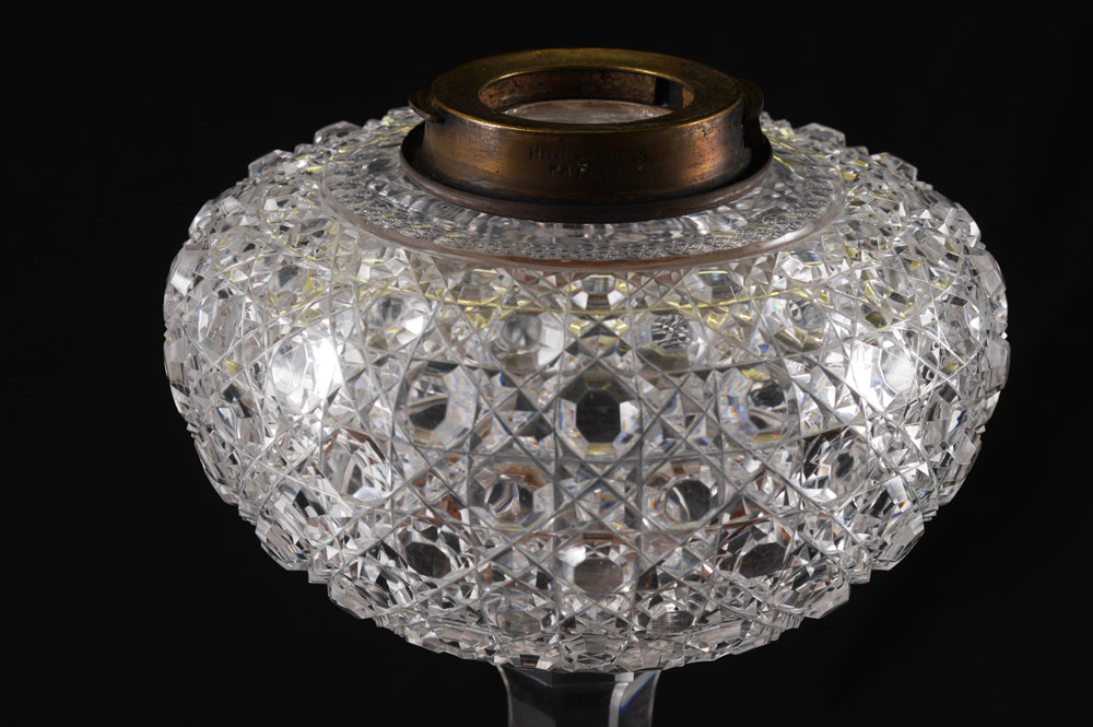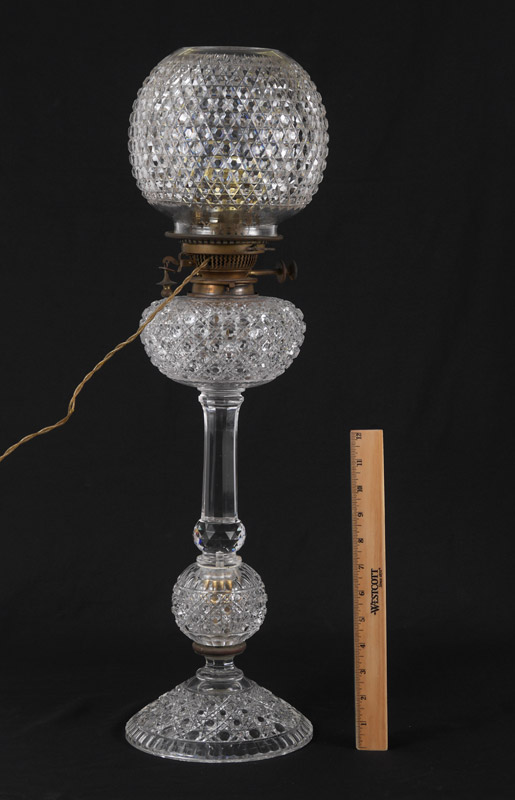 HINKS & SONS AMERICAN BRILLIANT CUT GLASS LAMP: Cut glass base, body and reservoir, burner marked Hinks & Son's Patent. Electrified, replacement glass globe. Base to top of socket measures 21 3/4'' h. x 7'', globe 7'' h., fitter rim 4''.