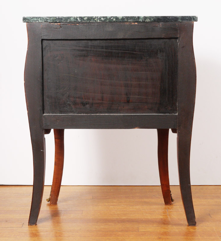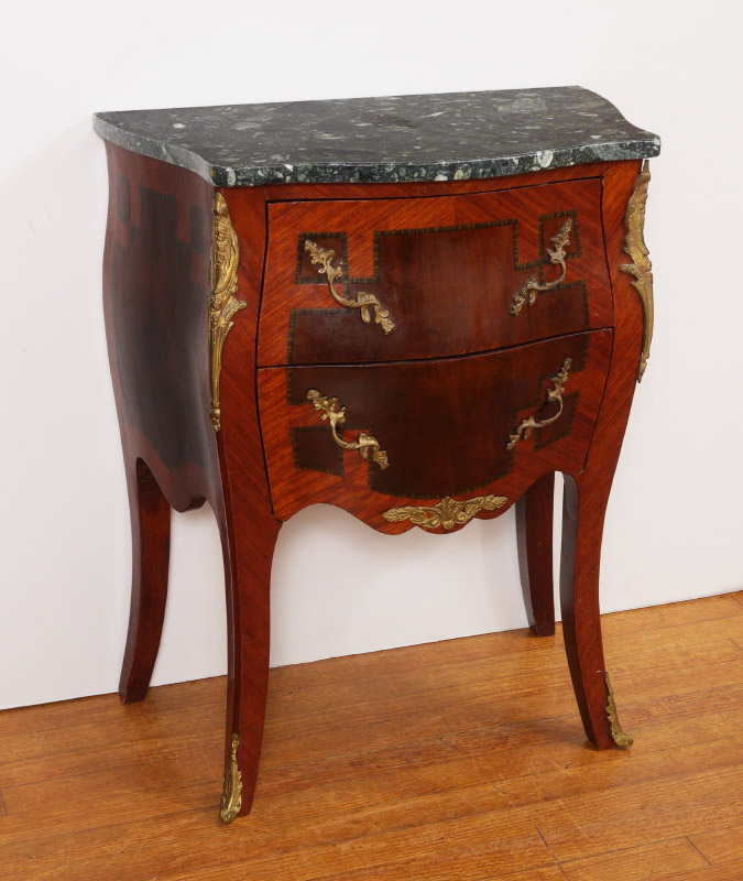 MARBLE TOP 2 DRAWER NIGHT STAND: Shaped marble top, bombe style 2 drawer base with shaped legs, parquetry inlaid decoration, ormolu mounts and handles. Overall measures 30 1/2'' h. x 24 1/2'' x 15''.