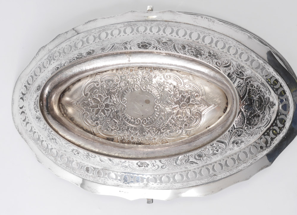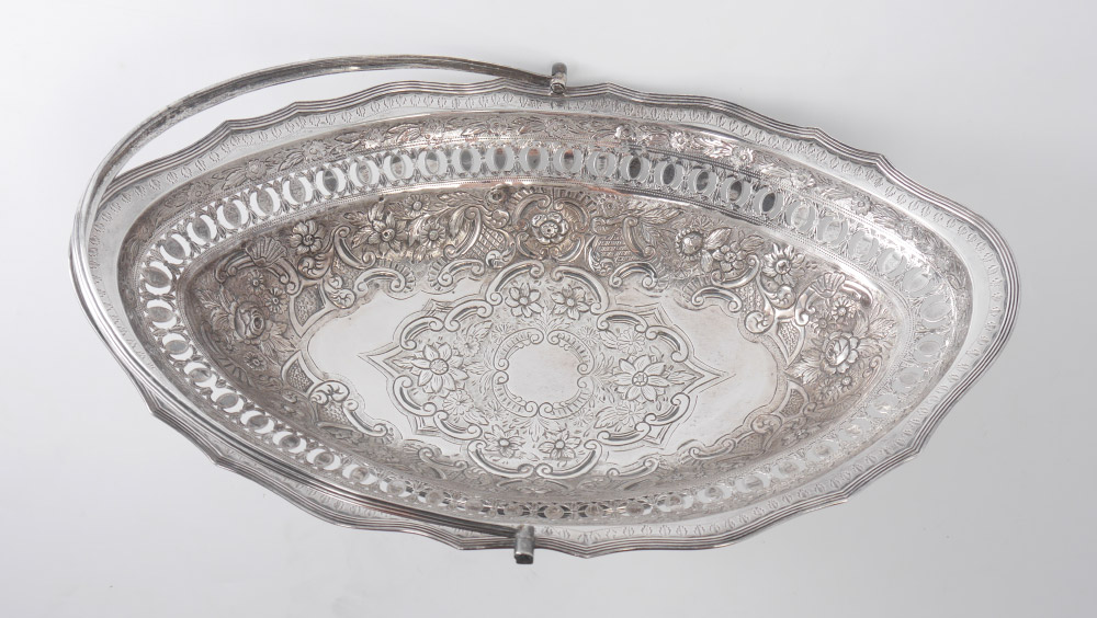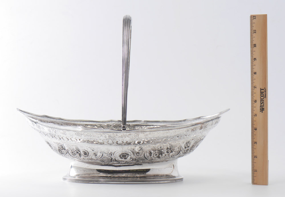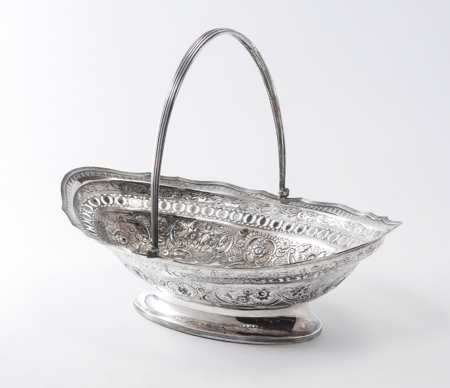 GEORGIAN RETICULATED REPOUSSE ENGLISH SILVER BASKET: Scalloped shaped rim with pierce work border, repousse floral motif body, footed base, articulated handle. Illegible makers and date marks, other marks indicate late 18th to early 19th century manufacture. 6 1/8'' h. x 16'' x 10 1/4'', approx. 28.1 troy oz.