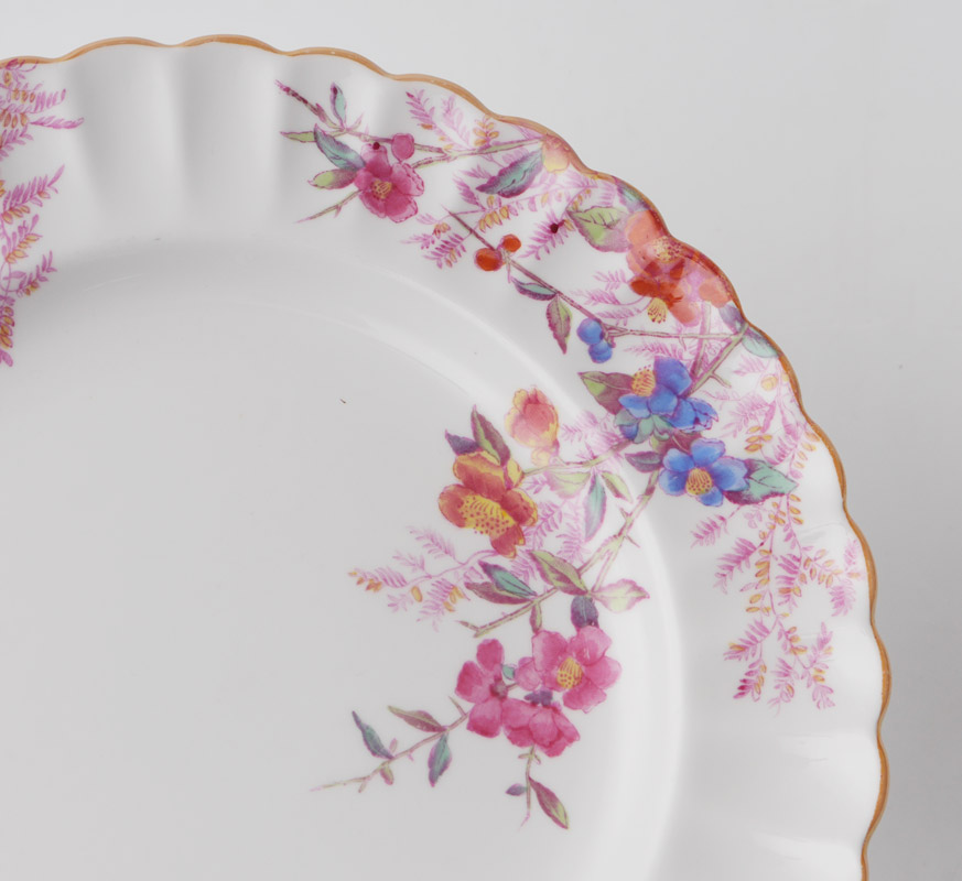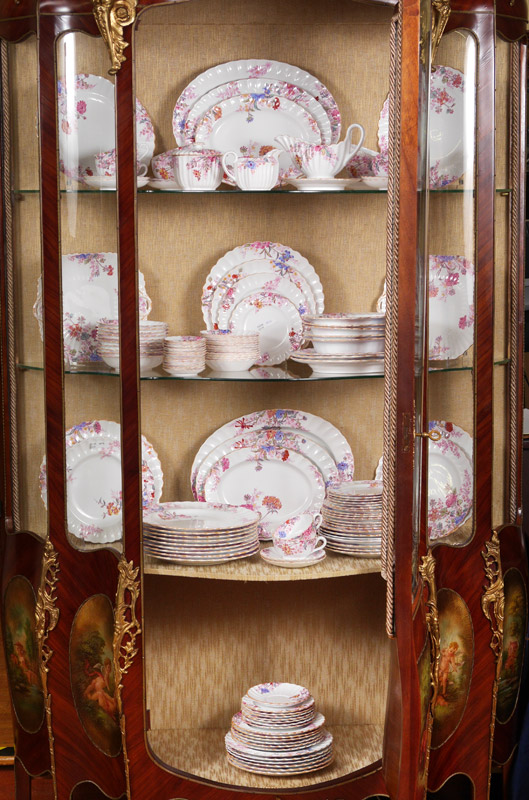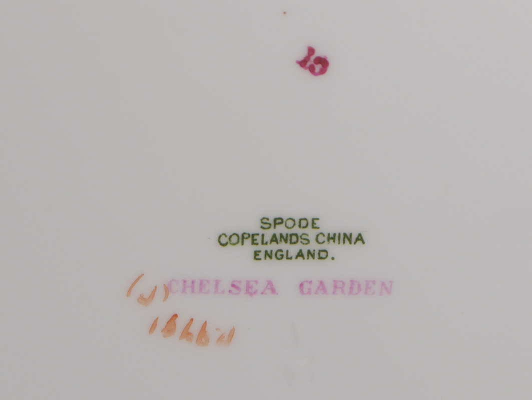 SPODE ''CHELSEA GARDEN'' FINE CHINA SERVICE: Approx. 132 pieces to include 14 dinner plates (10.75''), 14 salad plates (8''), 16 luncheon plates (9''), 14 bread plates, 10 cereal or soup bowls, 12 dessert bowls, 10 cups, 11 saucers, 13 butter pats, 4 open vegetable bowls, gravy with attached underplate, creamer, covered sugar, 3 platters (10''), 4 platters (12''), 2 platters (14''), and 2 pierced handle square cake plates.
